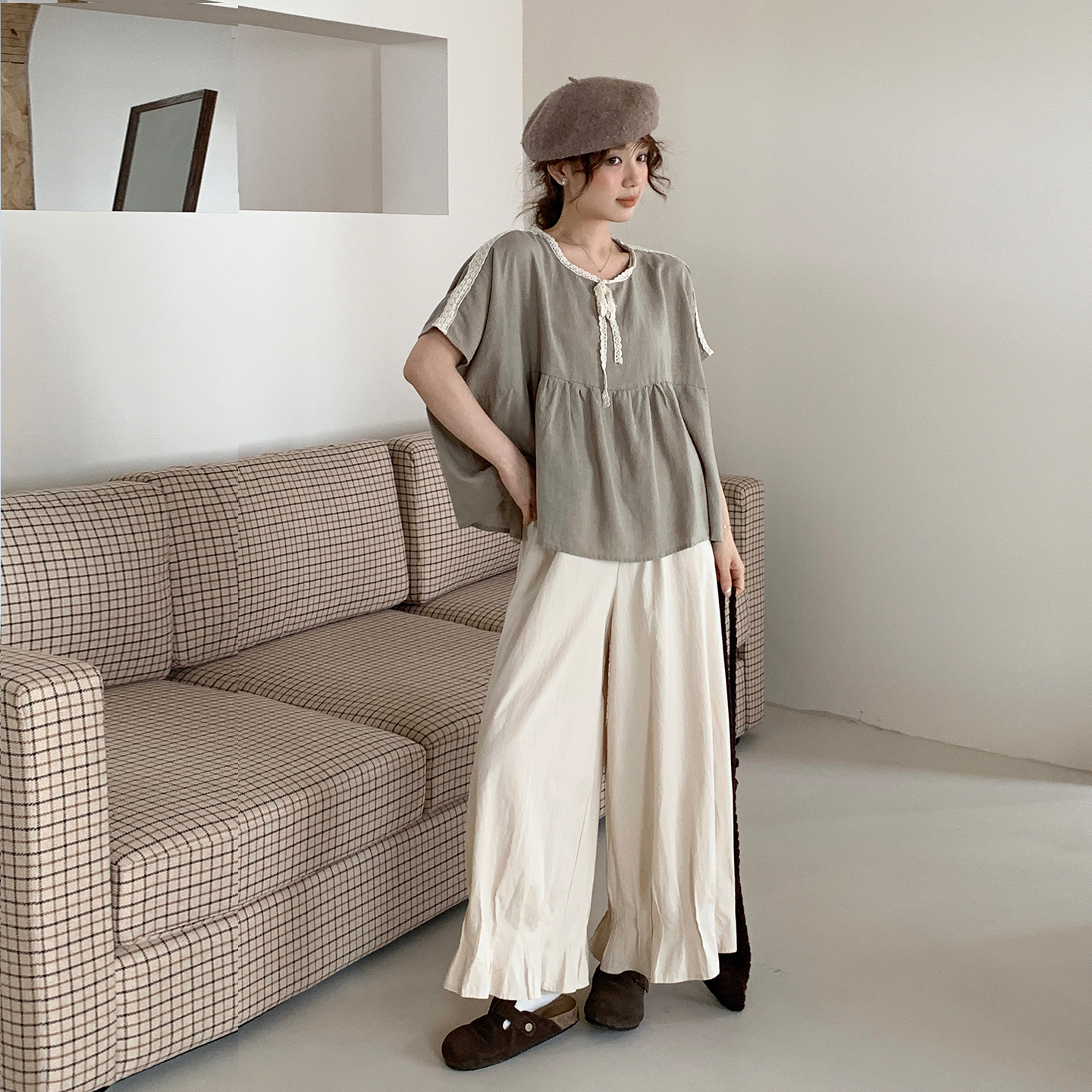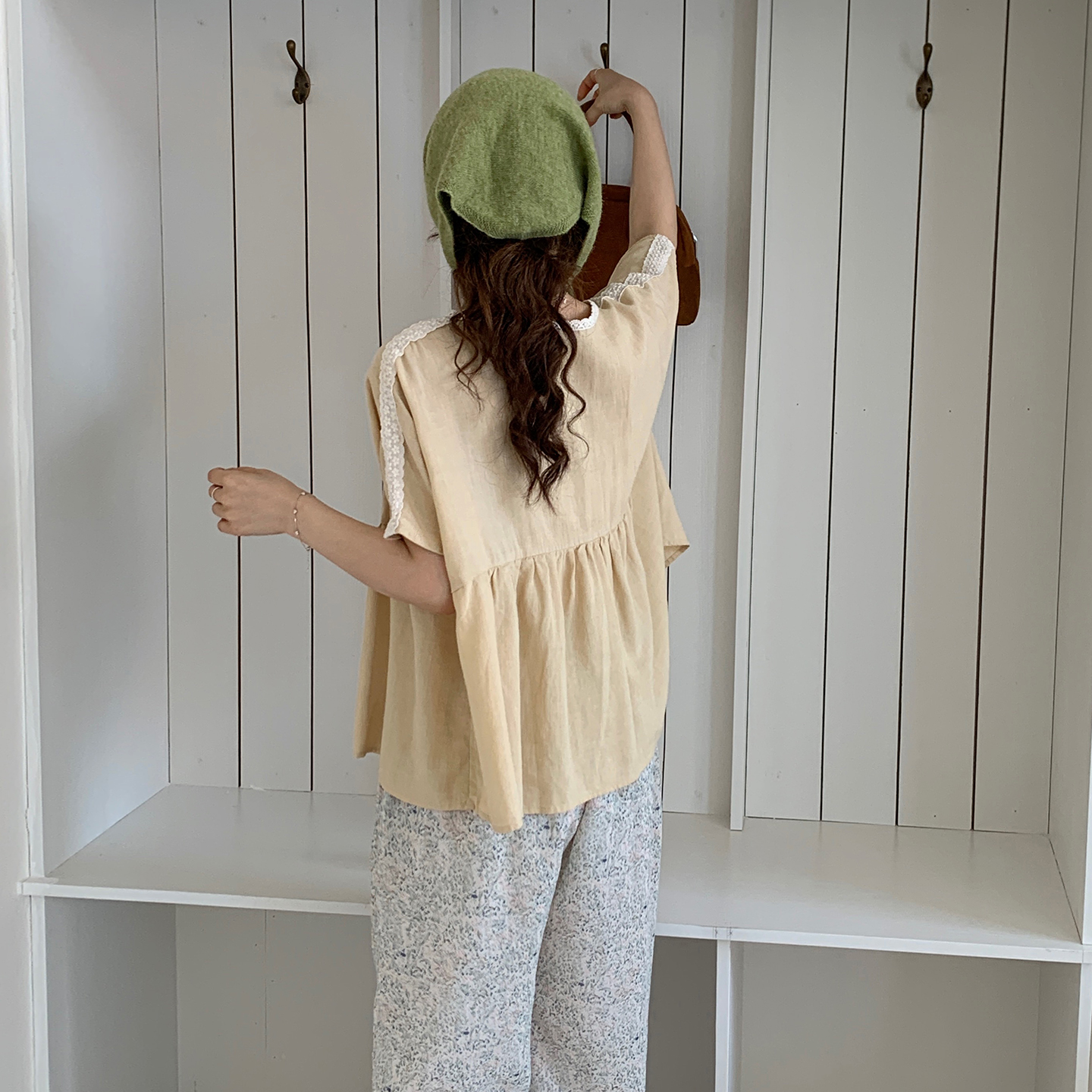 新款 上衣2025夏季 女衬衫 CRISP日系穿搭100%苎麻蕾丝花边系带小衫
