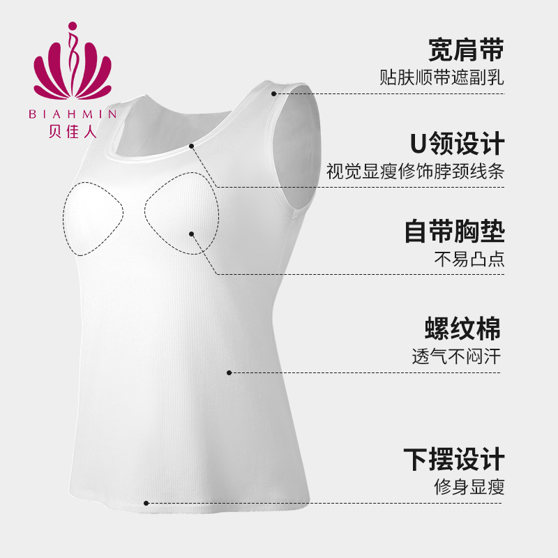 小衫 文胸背心内衣修身 防走光上衣女 U领自带杯垫一体式 贝佳人新款