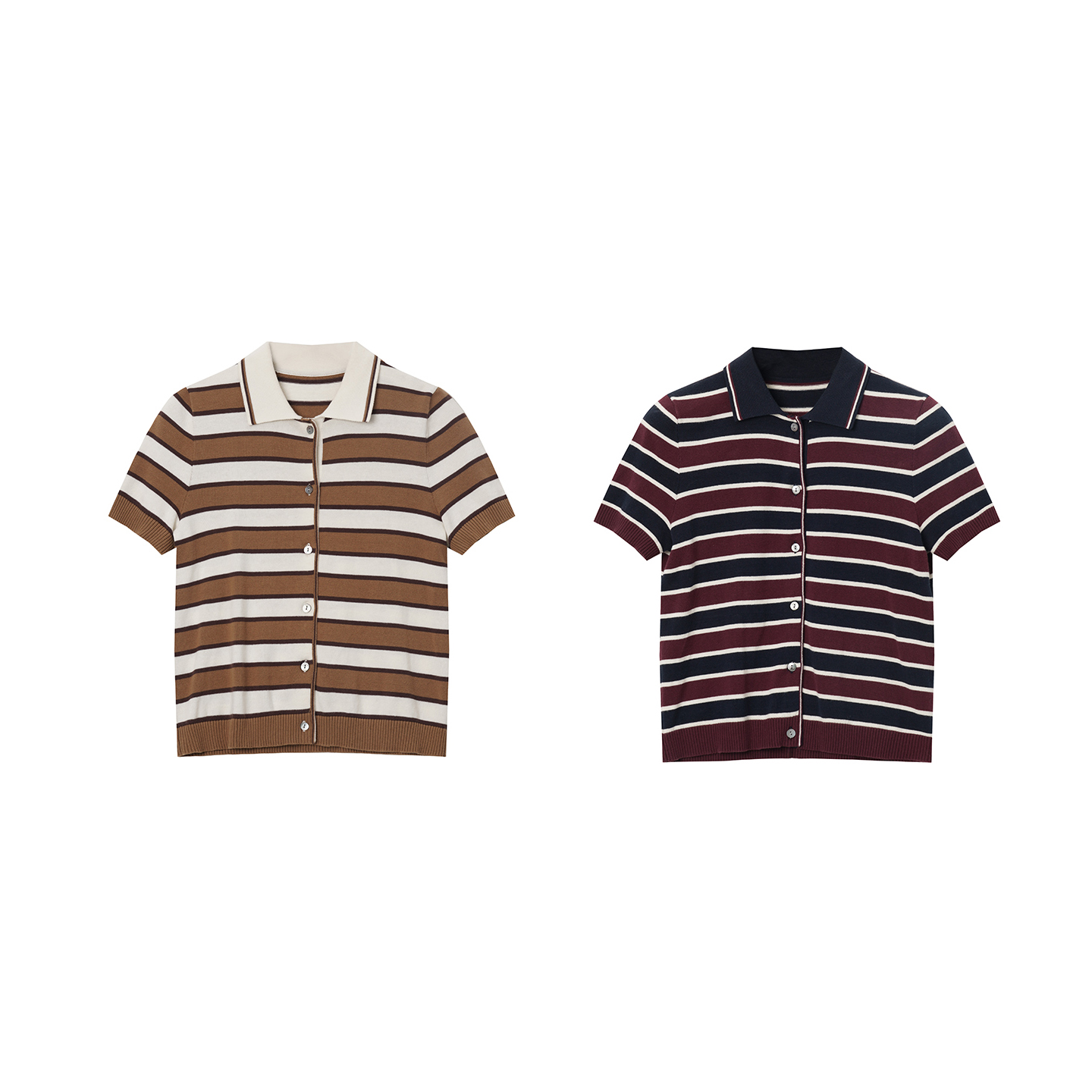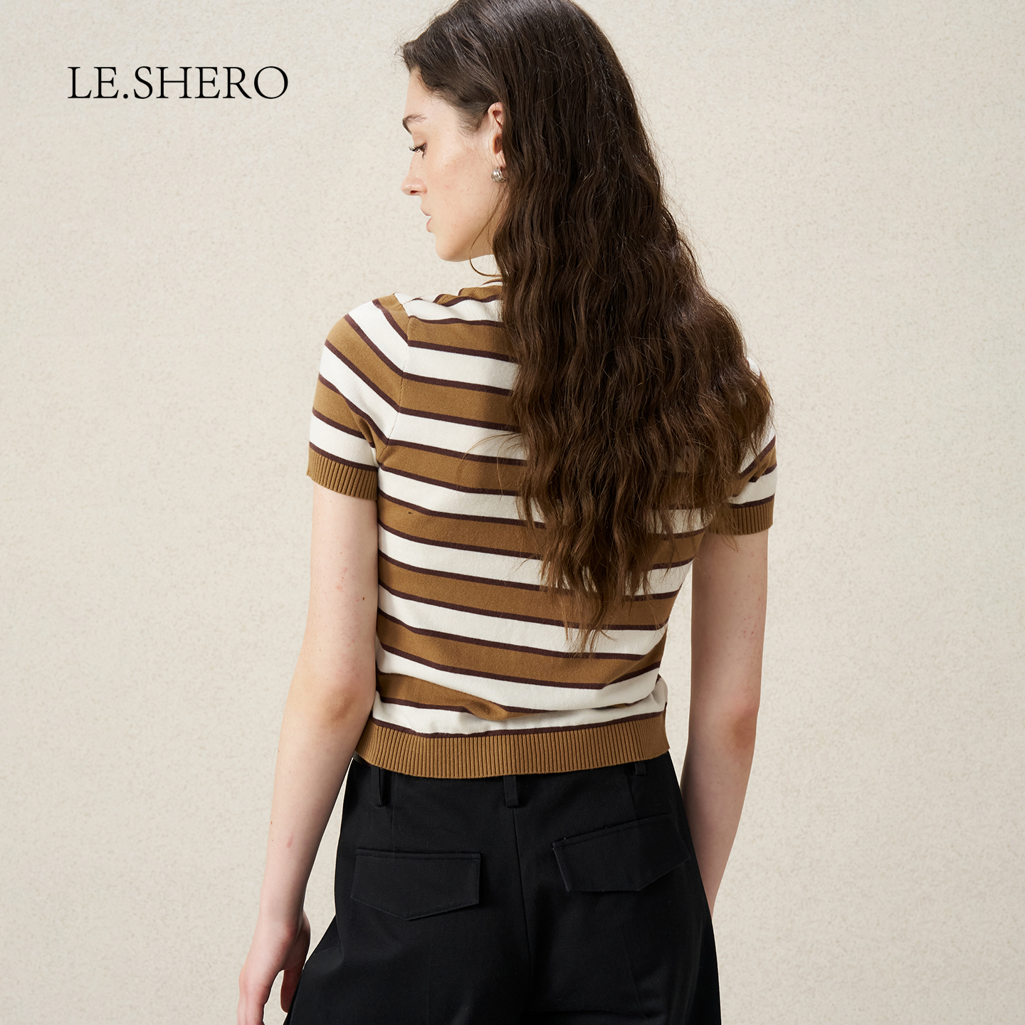 LE.SHERO原创设计翻领条纹排扣纯棉毛针织开衫 上衣 女休闲百搭短袖