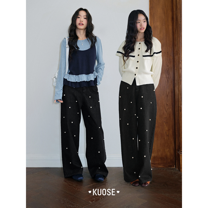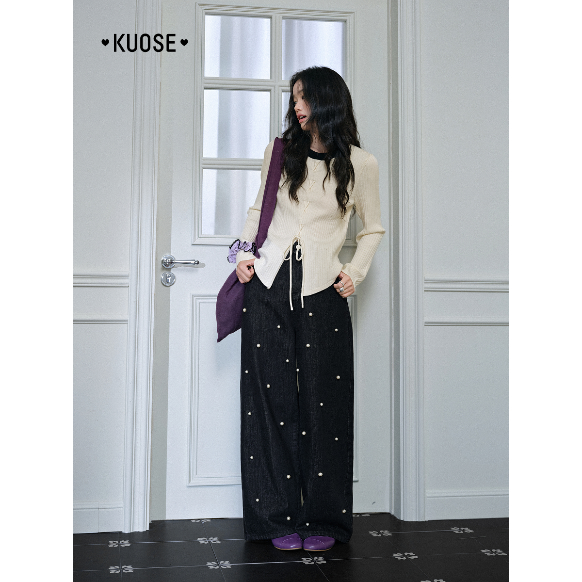 长裤 阔色气质黑色宽松直筒珍珠牛仔裤 设计感阔腿裤 新款 夏 女25秋季