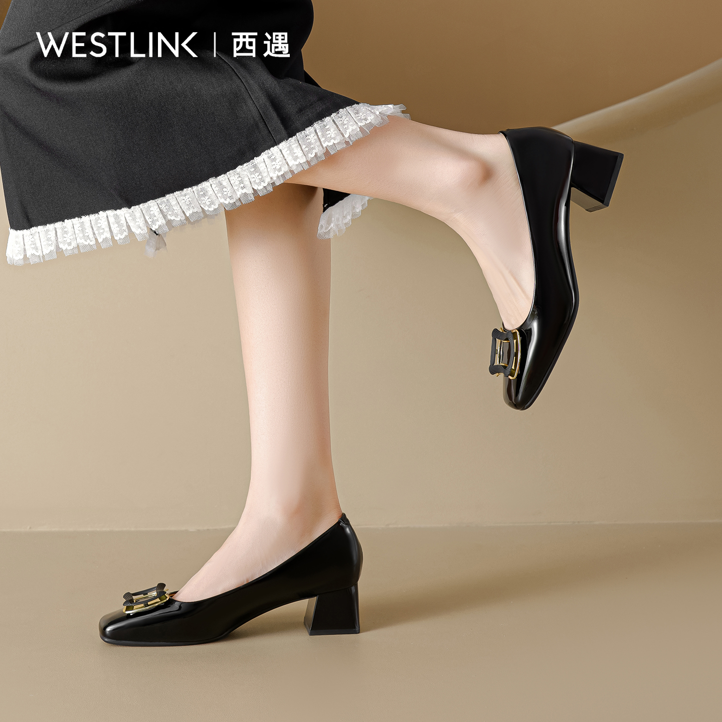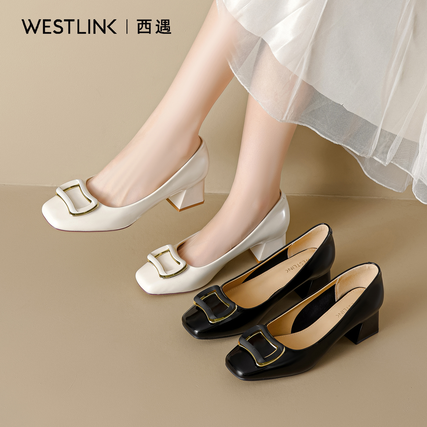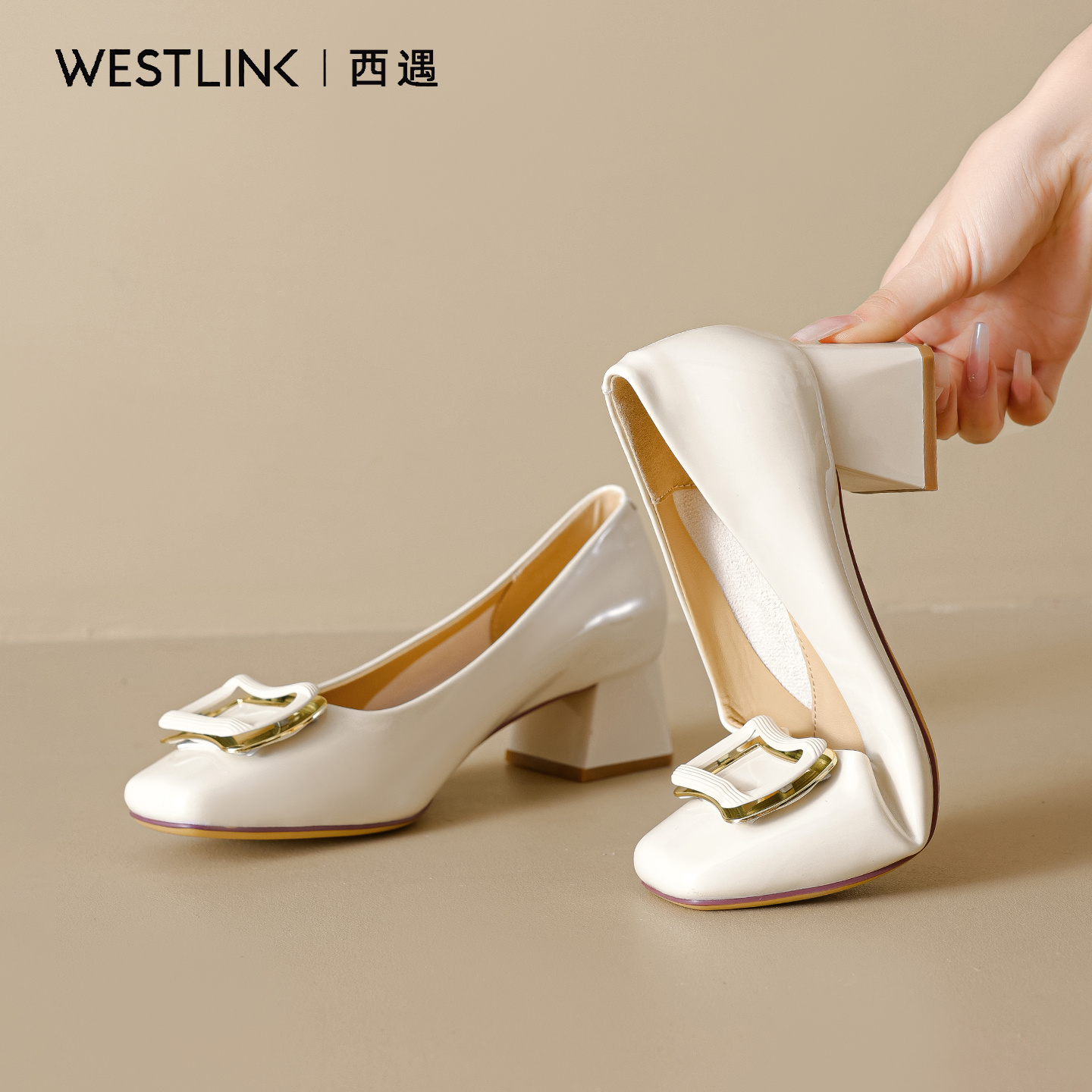 单鞋 通勤鞋 女2025新款 配旗袍工作皮鞋 浅口方头粗跟裸色鞋 真皮法式