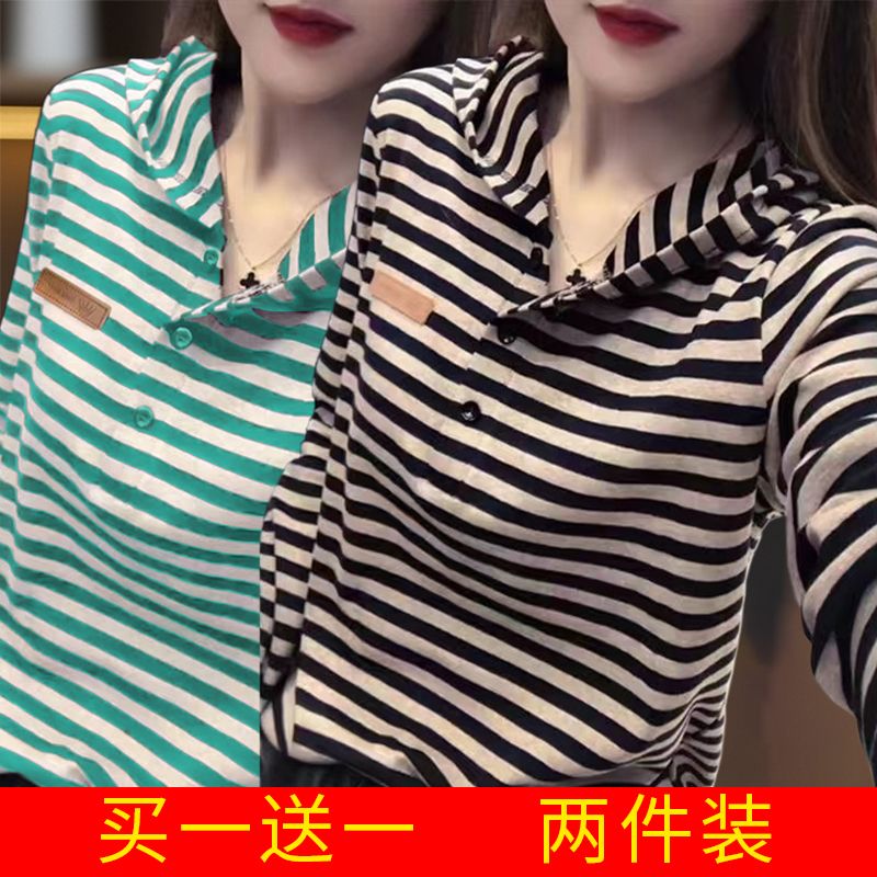 T恤 复古文艺休闲纽扣上衣显瘦百搭长袖 连帽条纹卫衣女春秋季 新款