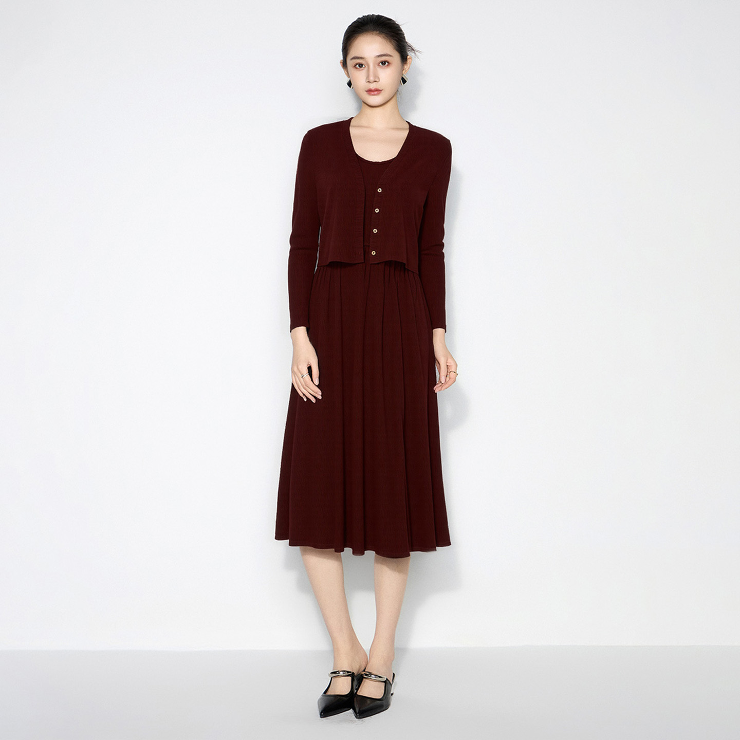 时尚 圆领连衣裙子两件套装 女 红色V领针织开衫 马天奴2025秋冬新款