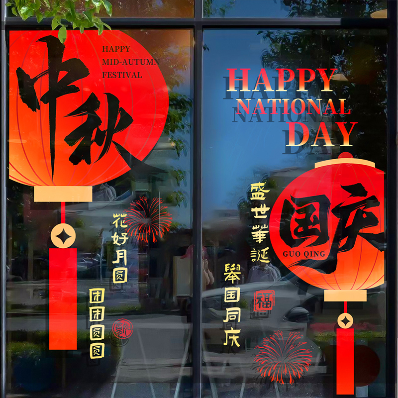 中秋国庆节日活动氛围布置装 饰品窗花银行商场店铺场景玻璃门贴纸