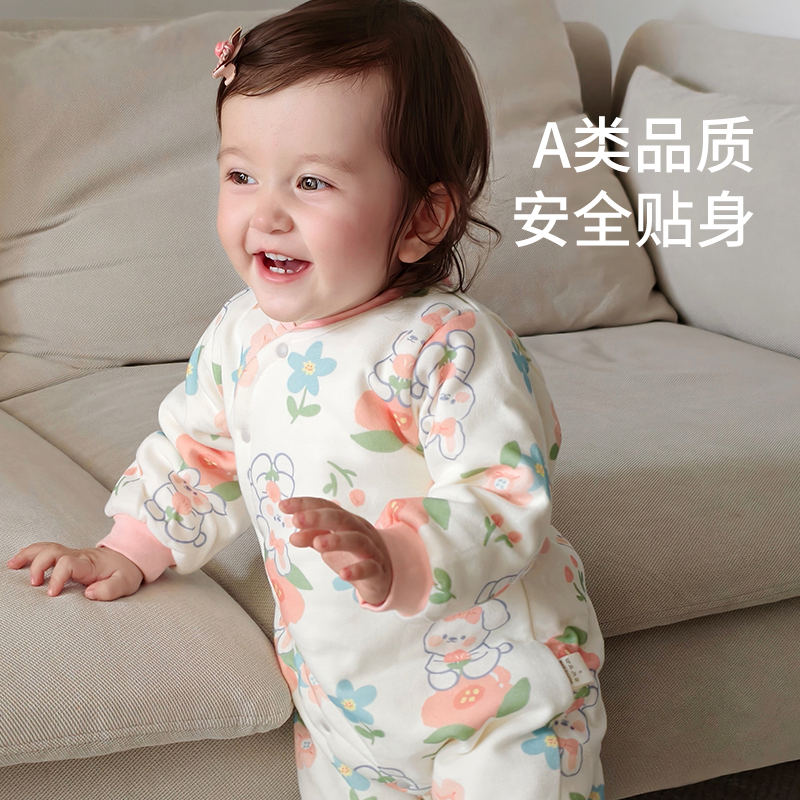 婧麒新生婴儿儿连体衣秋冬款 哈衣宝宝爬爬服居家衣服 斜襟护肚长袖