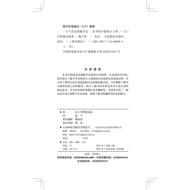 数学史:从手指计数到AI文明 社新华书店正版 日 研究方法人民邮电出版 矢野健太郎自然科学史 一口气读完