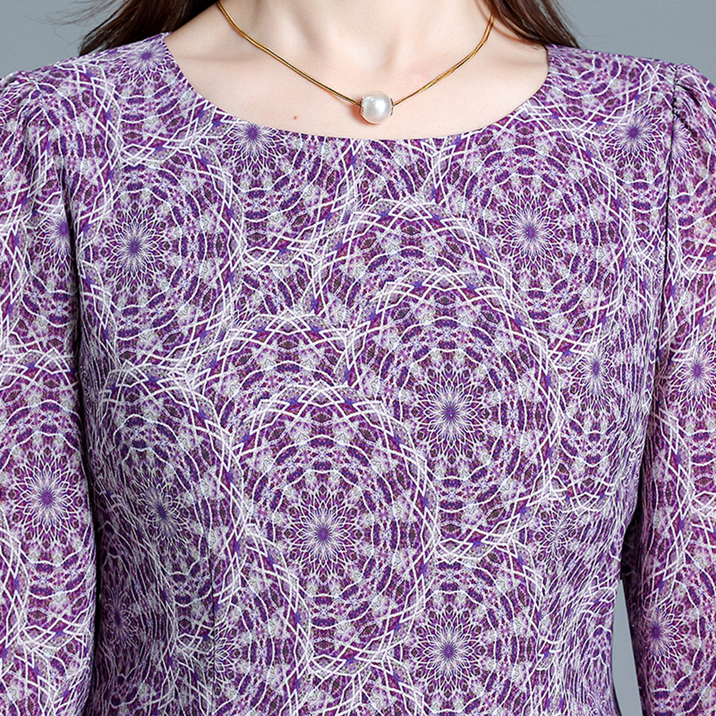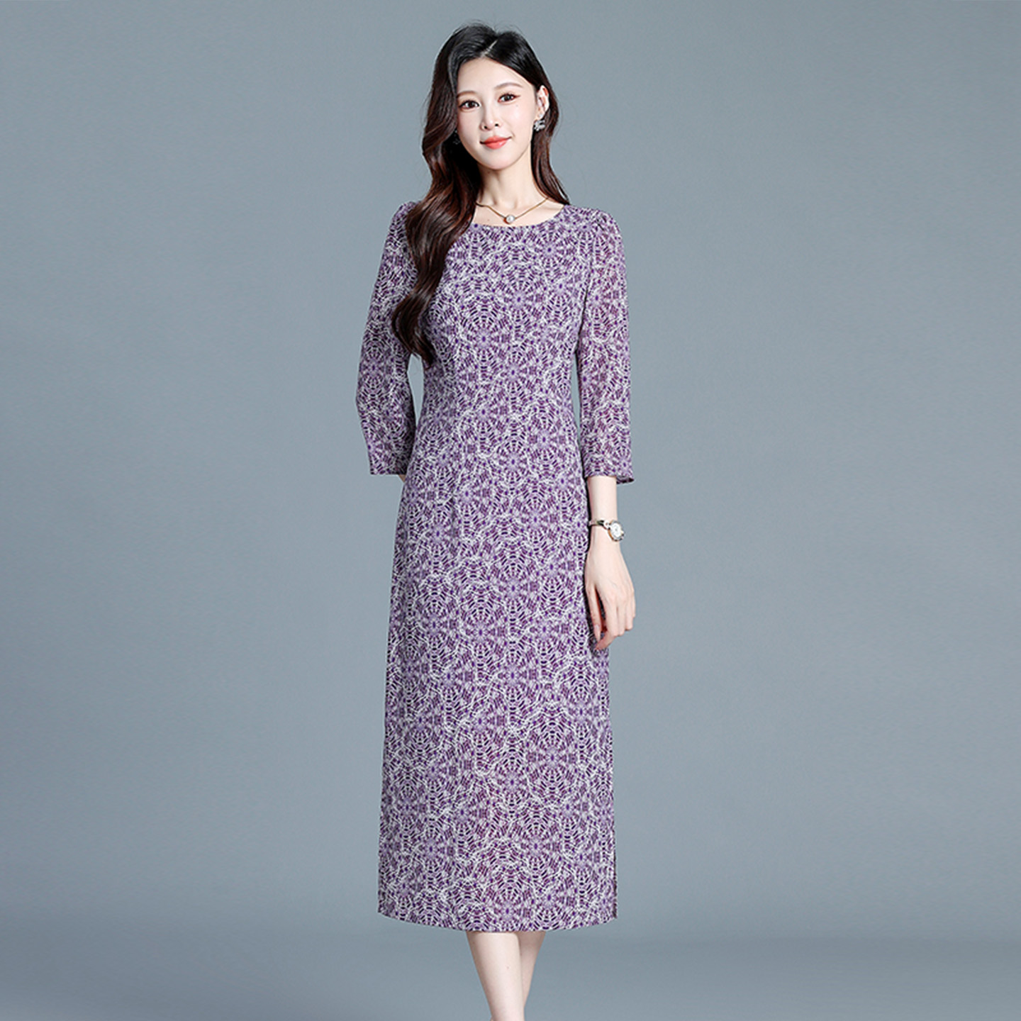 埃伦妈妈连衣裙2025初秋圆领七分袖 收腰显瘦气质优雅过膝减龄长裙
