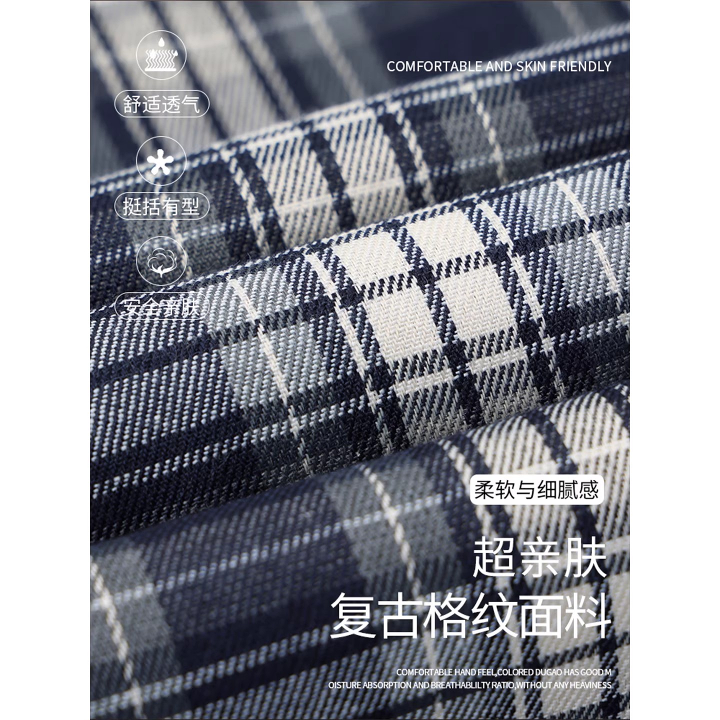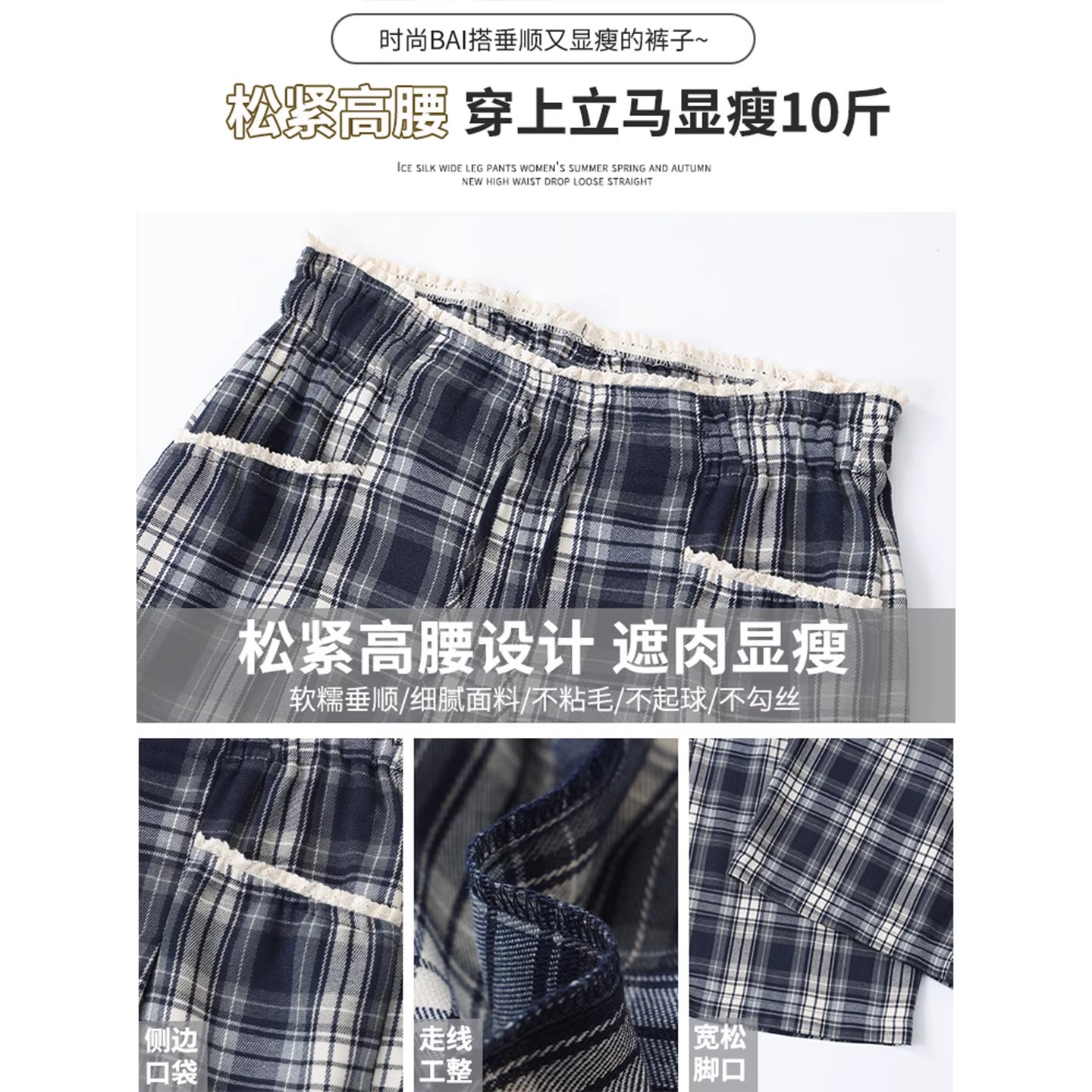 蕾丝花边直筒休闲高腰显瘦阔腿裤 2025新款 女夏季 藏青色复古格子裤