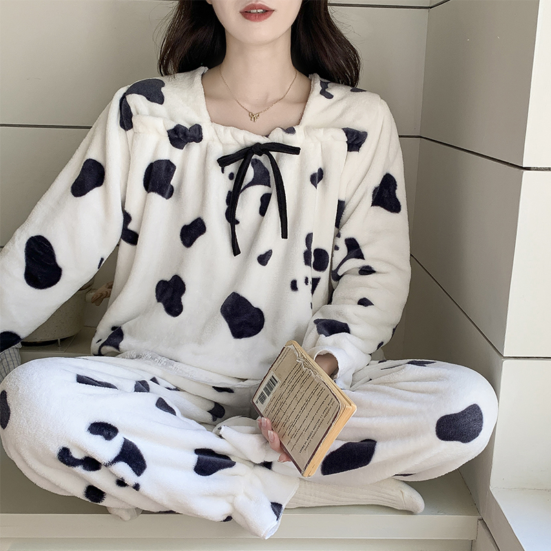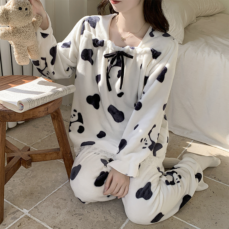 可爱少女士法兰绒冬天家居服 大码 睡衣女秋冬款 加绒加厚珊瑚绒长袖