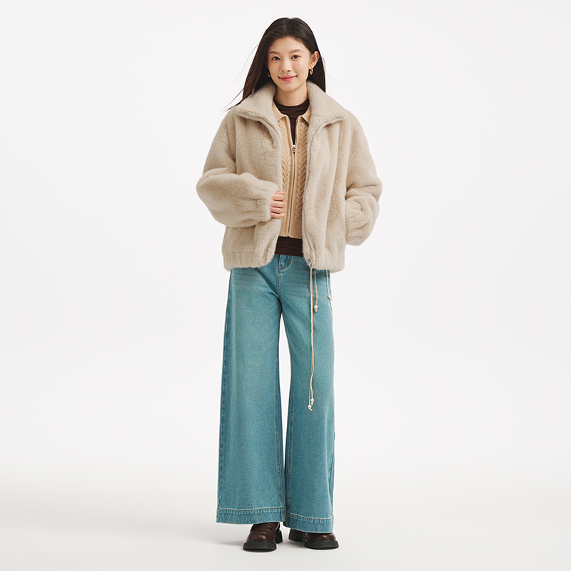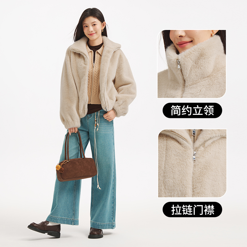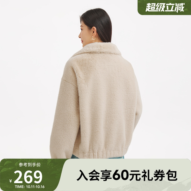 热风2025年冬季 女士温柔风仿皮草毛茸茸外套大翻领保暖显气质 新款