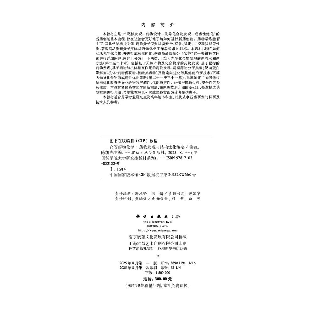 主编 适合药学专业 高等药物化学 社 科学出版 中国科学院大学研究生教材系列 陈凯先 柳红 药物发现与结构优化策略 现货正版