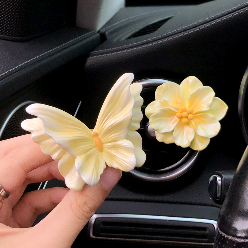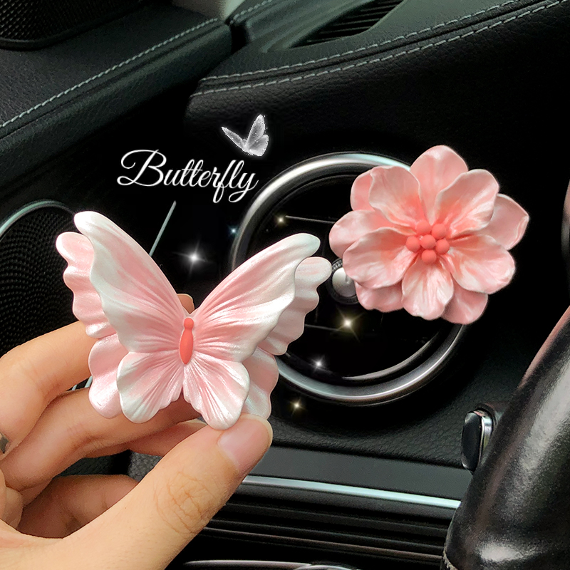蝴蝶车载香薰香水汽车空调出风口装 饰山茶花车内饰品摆件扩香石女