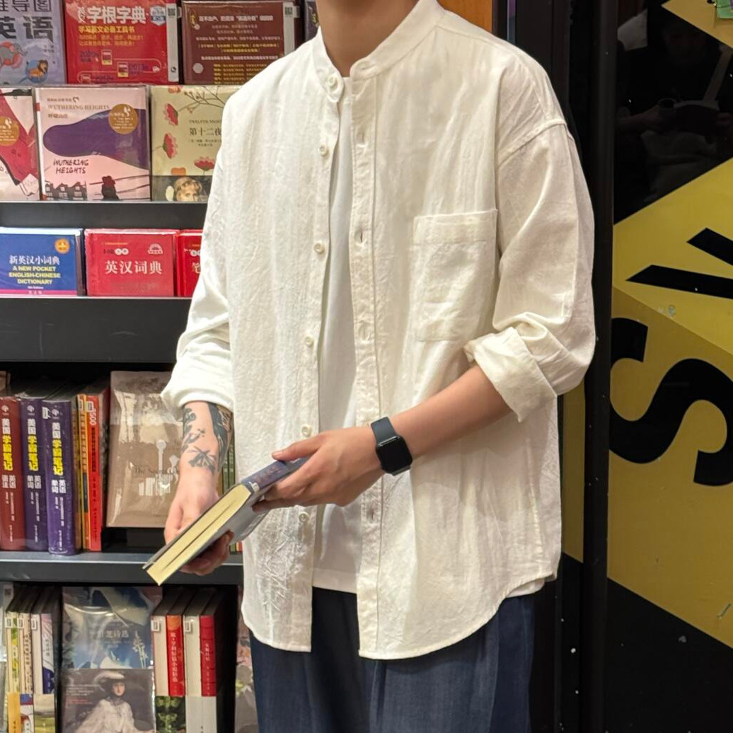 纹理感长袖 男秋季 衬衣复古慵懒风cleanfit外套 棉麻立领衬衫 新中式
