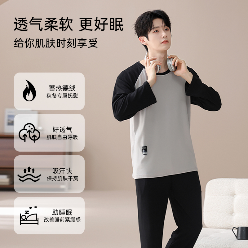大码 长袖 长裤 猫人纯棉睡衣男士 家居服套装 2025新款 纯色男士 春秋款