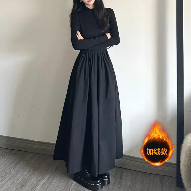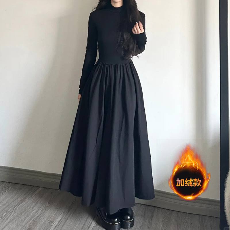 高级感收腰显瘦长裙子 赫本风2025秋冬新款 黑色长袖 连衣裙加绒法式
