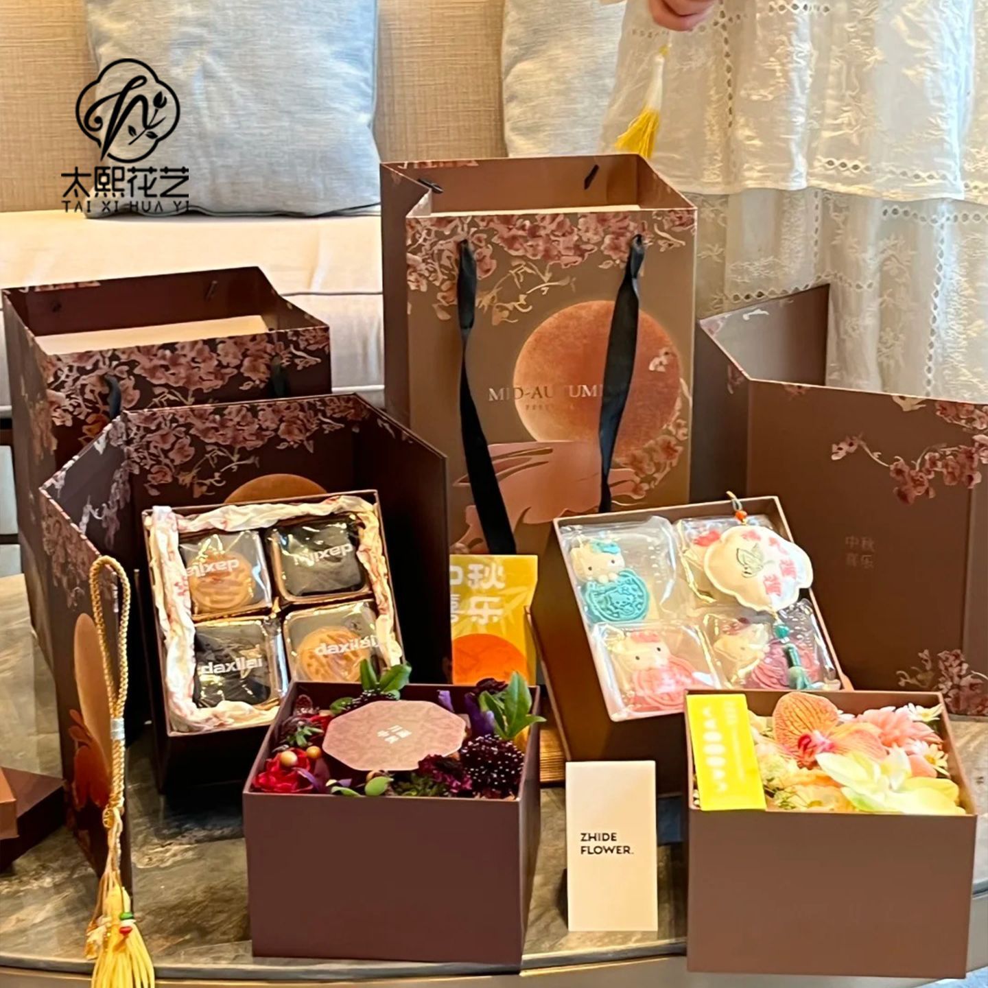 中秋节国风复古方形高档鲜花月饼手提袋包装 材料 礼盒空盒花束包装