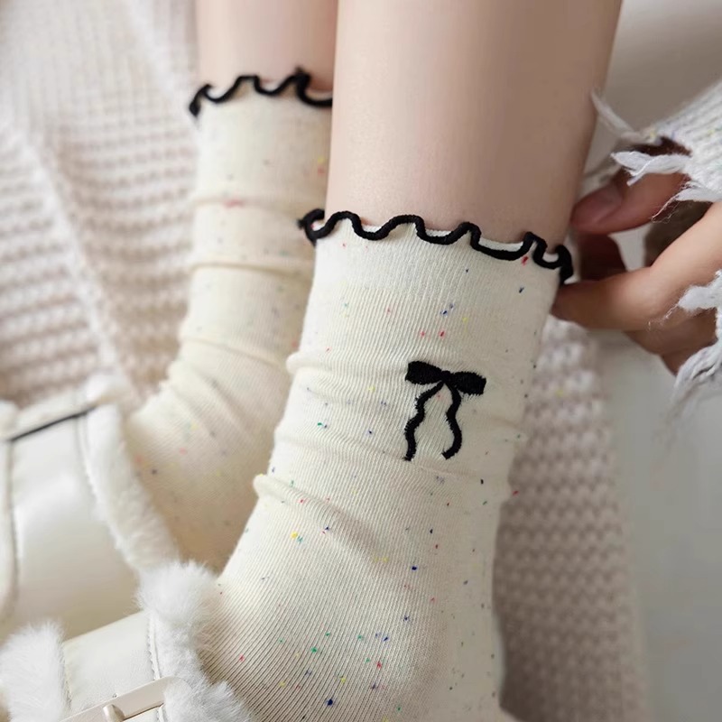 爆款 纯棉中筒袜2025新款 蝴蝶结木耳花边长筒袜 春秋季 堆堆袜子女款