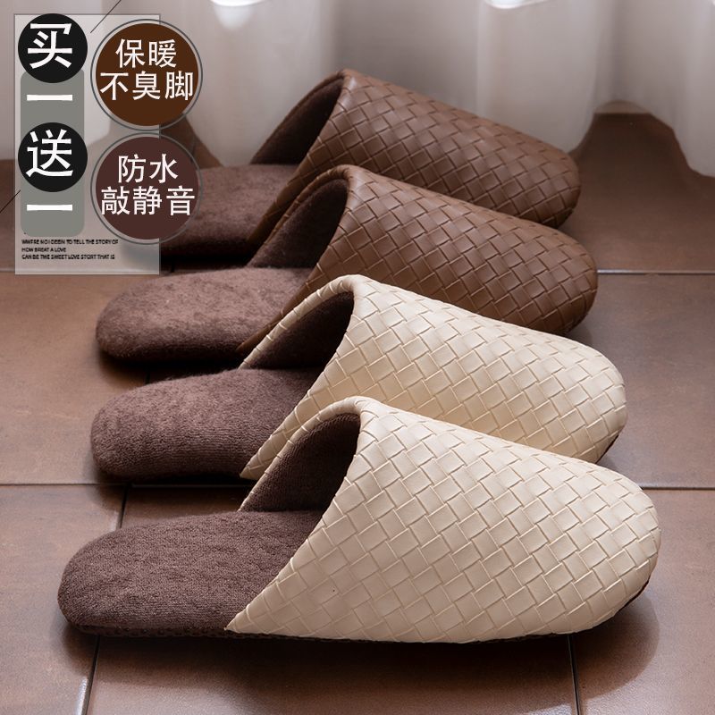 情侣室内家居pu防水保暖一对毛绒静音棉拖男 冬季 买1送1棉拖鞋 女款