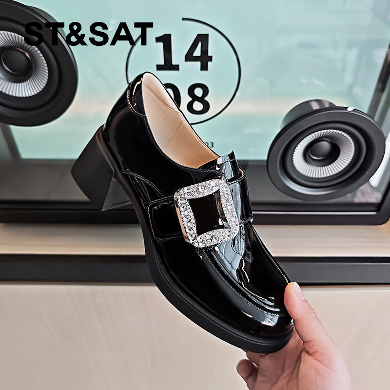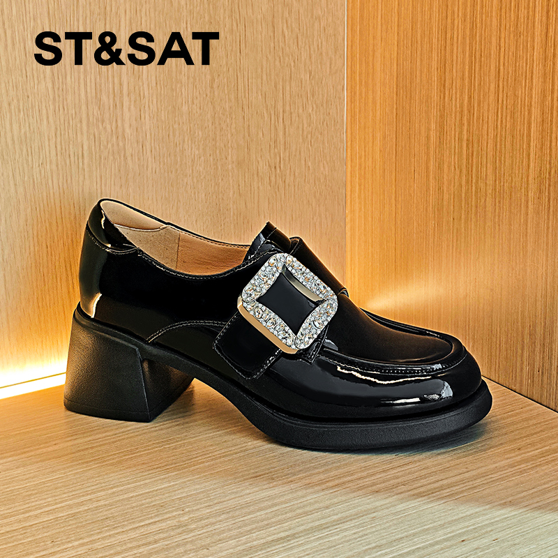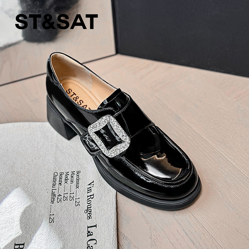 真皮水钻方扣单鞋 星期六英伦风乐福鞋 女2025漆皮圆头粗跟增高皮鞋