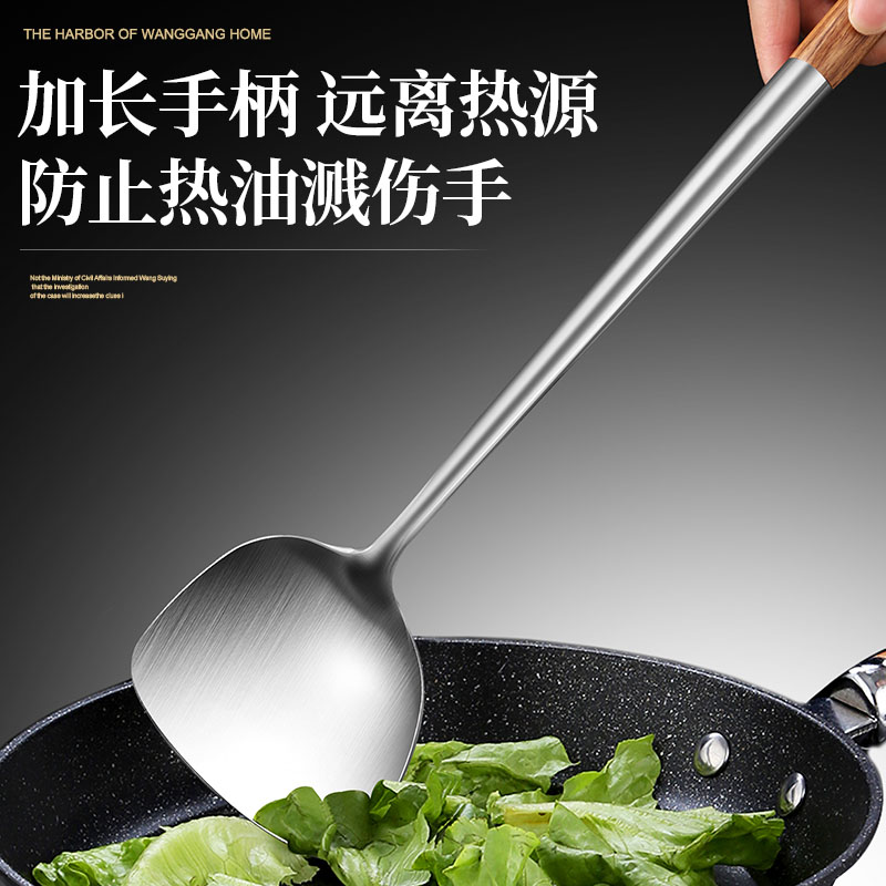 加厚304不锈钢炒菜勺子家用长柄汤勺盛汤漏勺加长锅铲子神器木柄