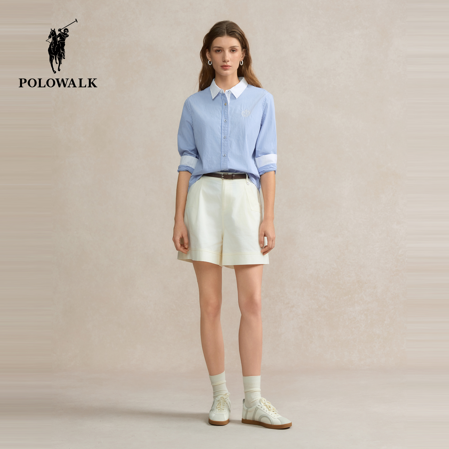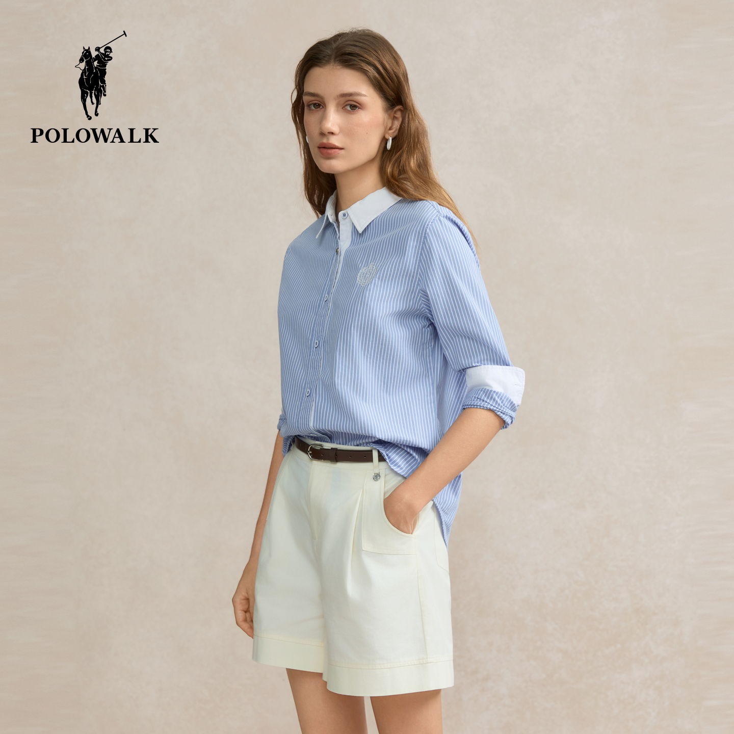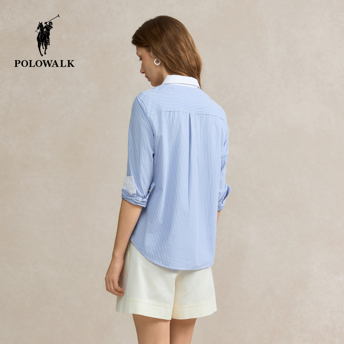 长袖 POLOWALK女式 衬衫 2025秋季 撞色条纹衬衣女装 新品 100%纯棉