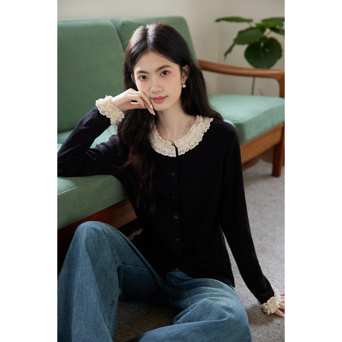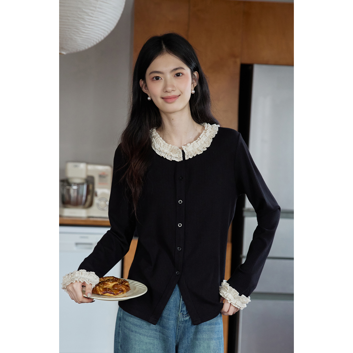 春秋木耳边打底上衣 t恤女外穿2025新款 弥古法式 蕾丝圆领黑色长袖