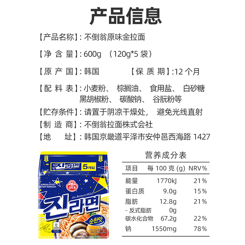 韩国进口不倒翁金拉面韩式 速食自煮夜宵冲泡方便面食 泡面袋装