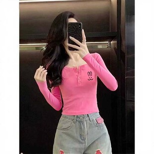 短款 玫粉色短款 时尚 t恤女春秋修身 高腰露脐洋气减龄辣妹上衣 长袖