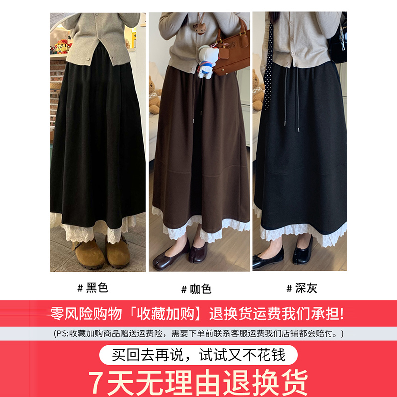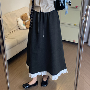 a字高腰垂感秋冬伞裙 中长款 黑色花边毛呢半身裙女秋季 2025年新款