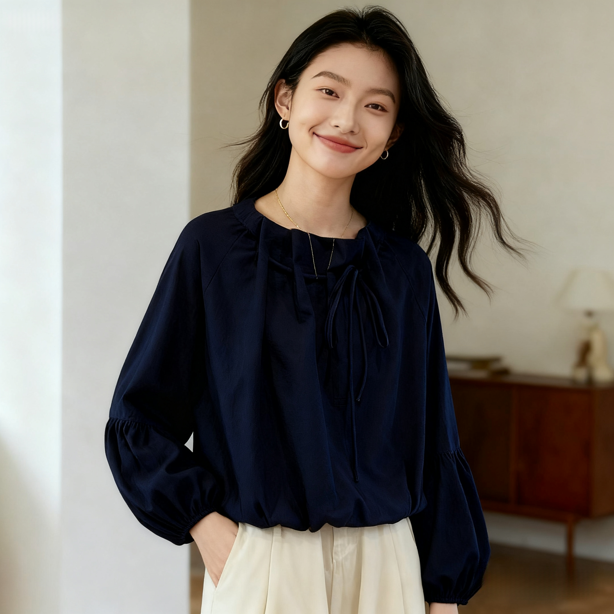 女胖妹妹宽松显瘦泡泡袖 秋款 衬衫 遮肚子独特漂亮系带长袖 上衣 大码