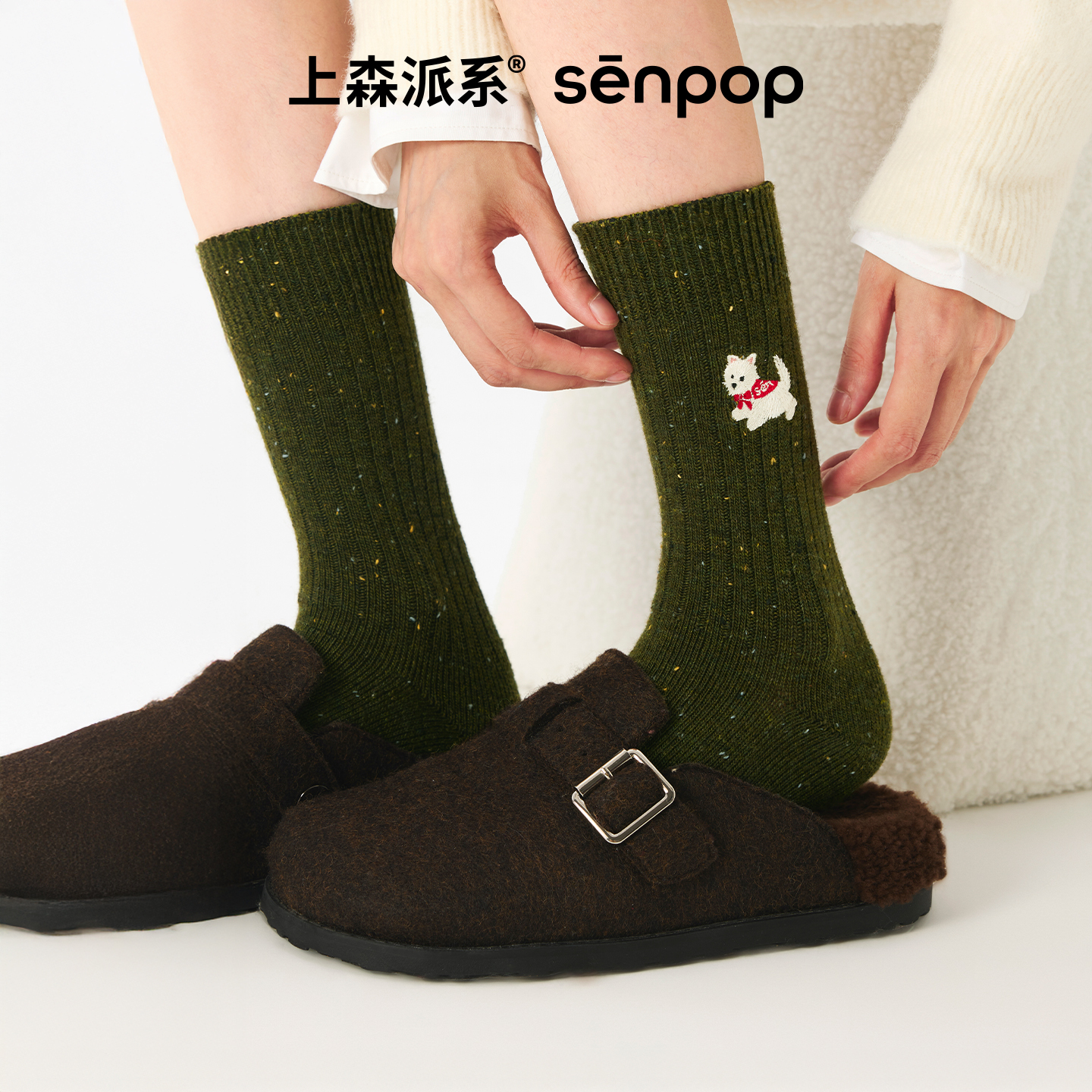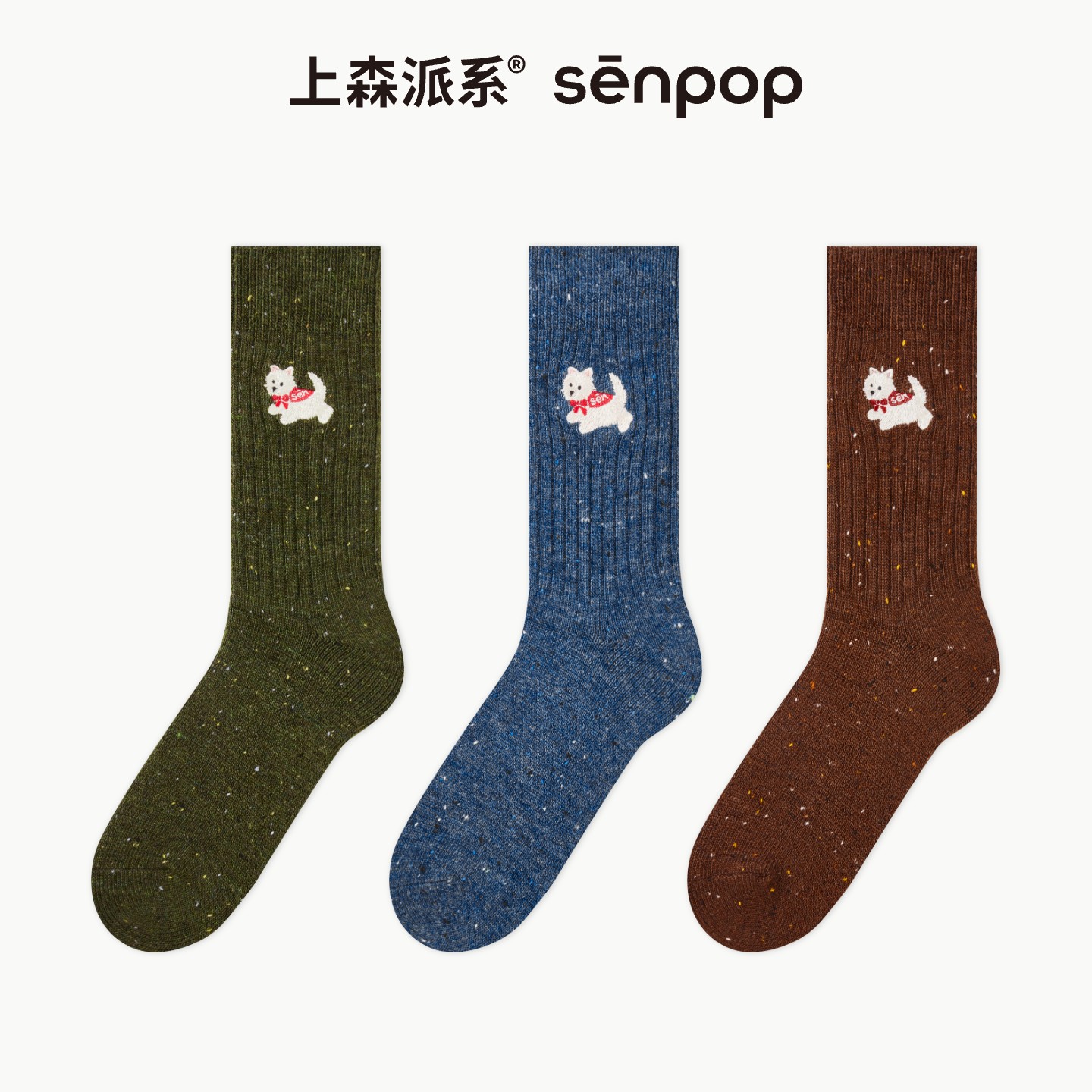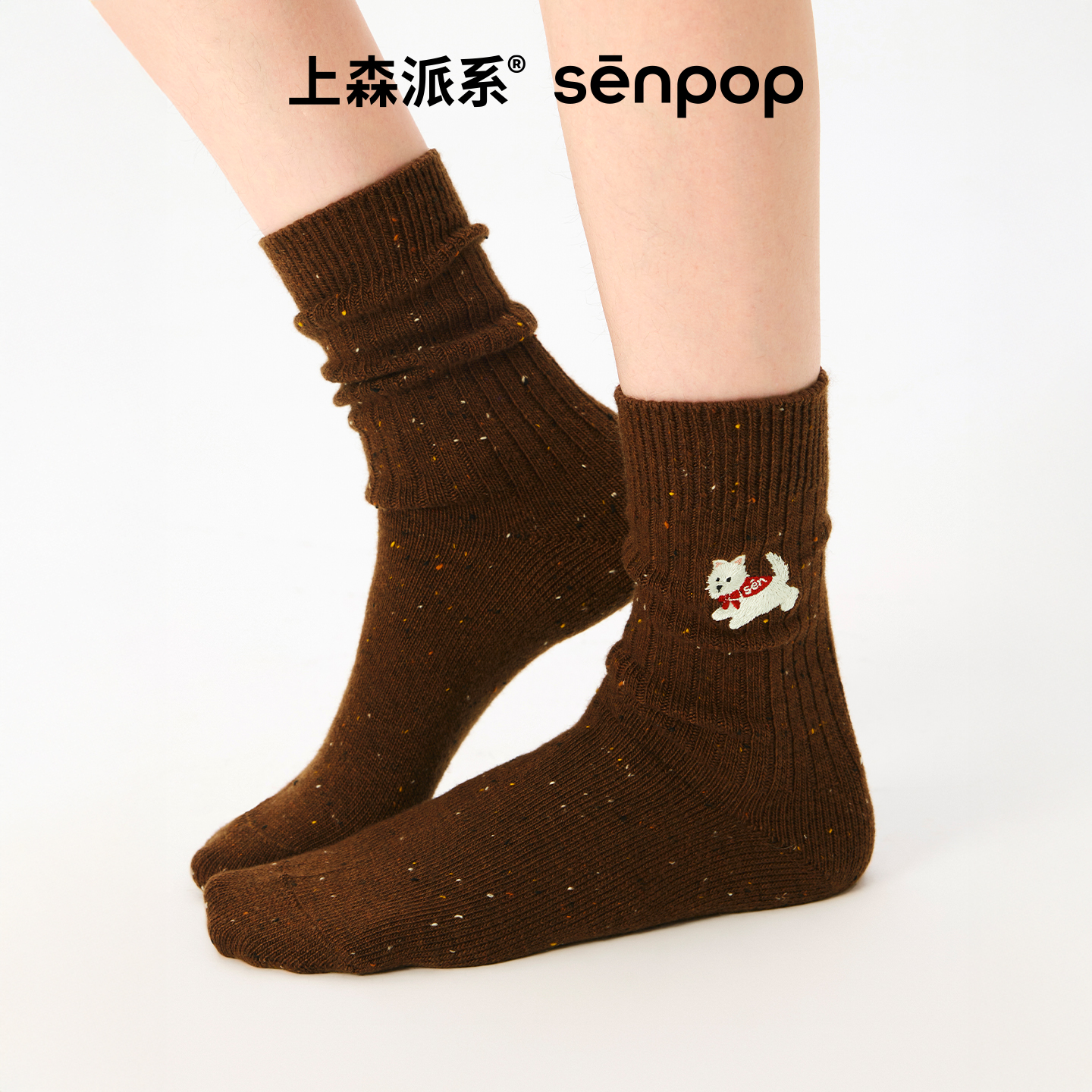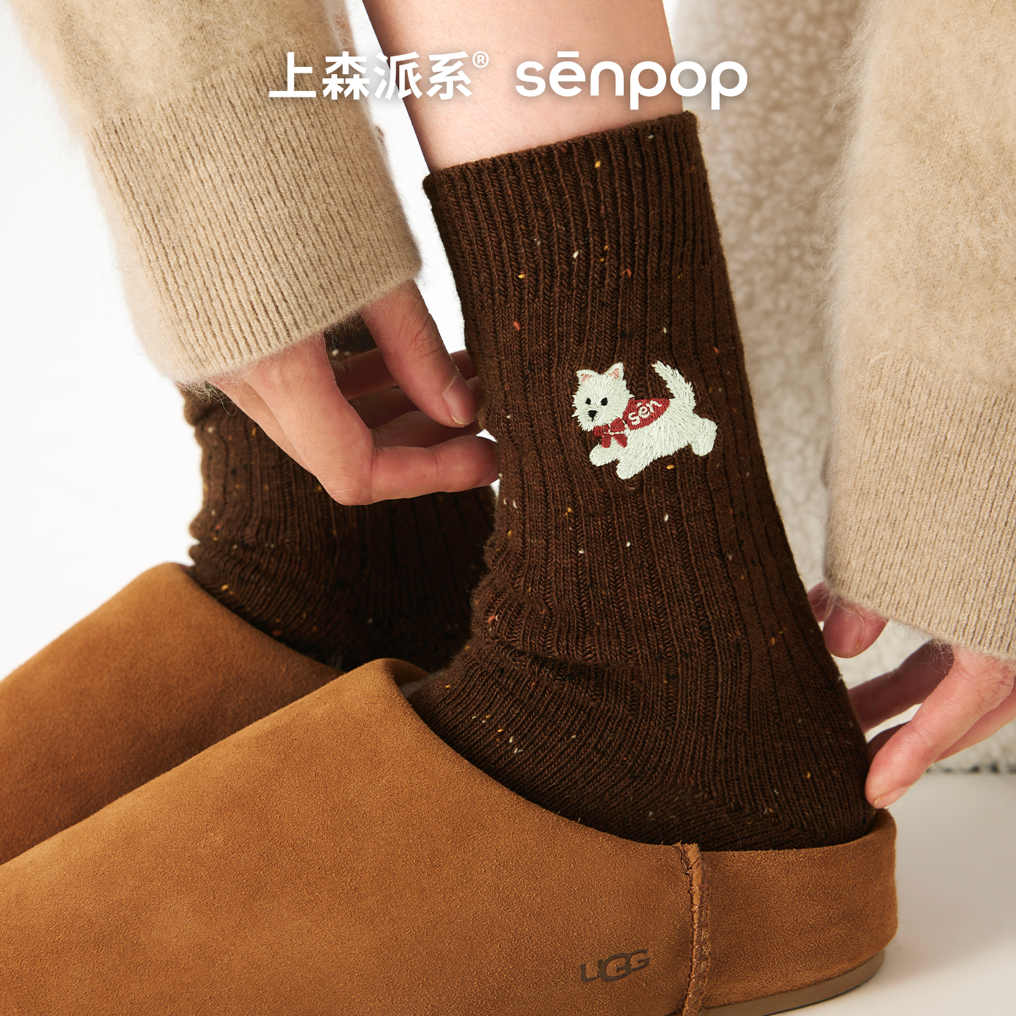 上森中筒袜女堆堆棉袜秋冬可爱小狗刺绣长袜棕色小腿袜搭勃肯鞋 袜