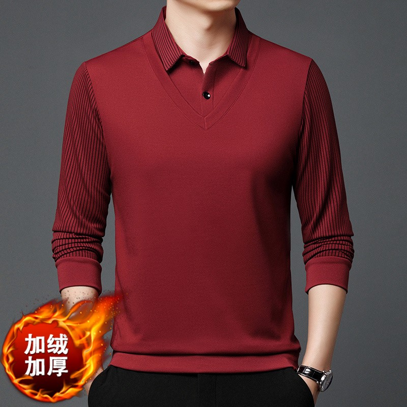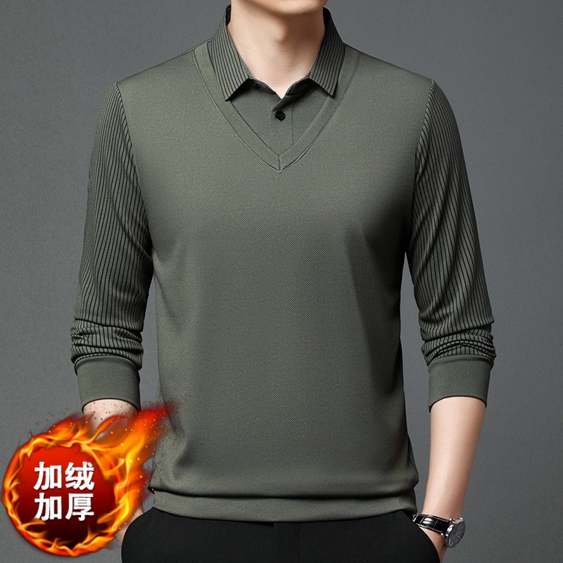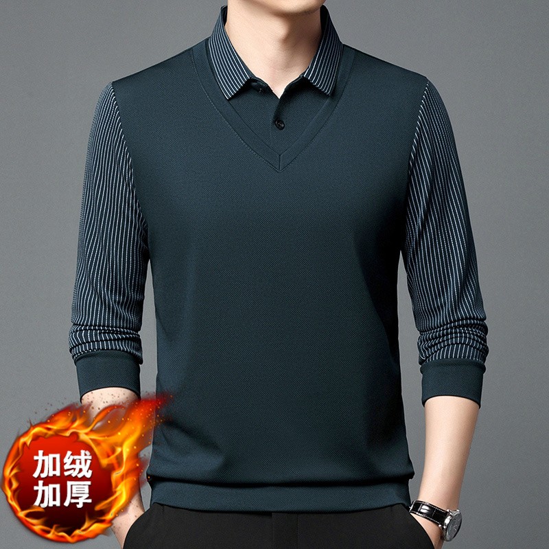 体恤加绒加厚假两件休闲保暖针织衫 新款 长袖 衬衫 秋冬中青年男士