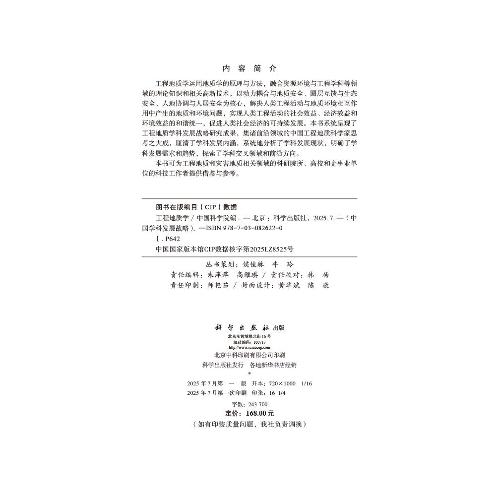 中国科学院 工程地质学 工程地质学运用地质学 原理与方法 理论知识和相关高新技术 融合资源环境与工程学科等领域 现货正版