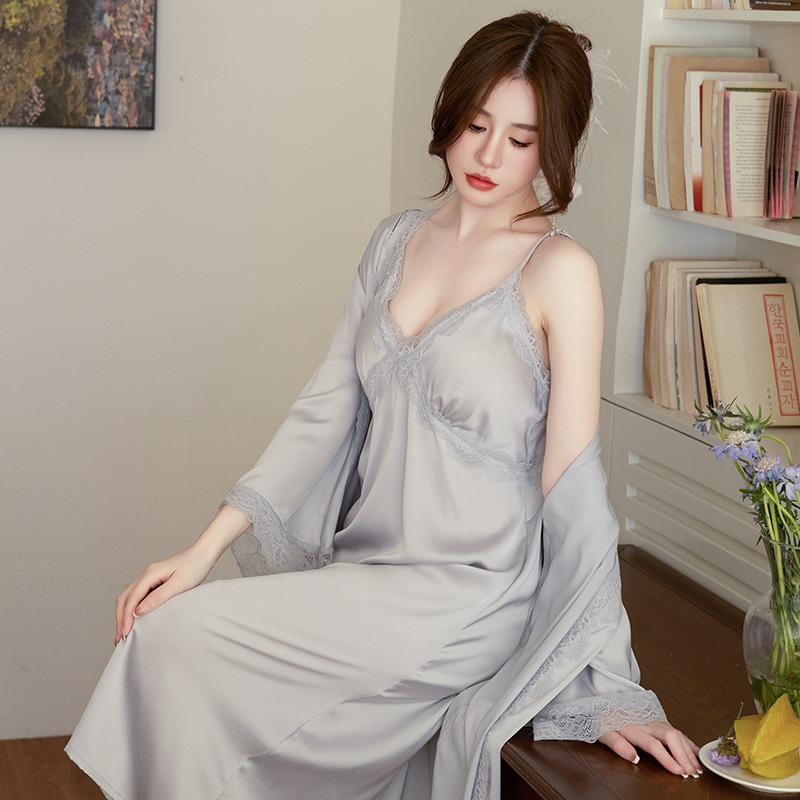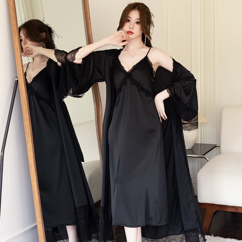2025新款 性感冰丝睡袍纯欲风高级感蕾丝吊带睡衣 睡裙女春秋夏薄款