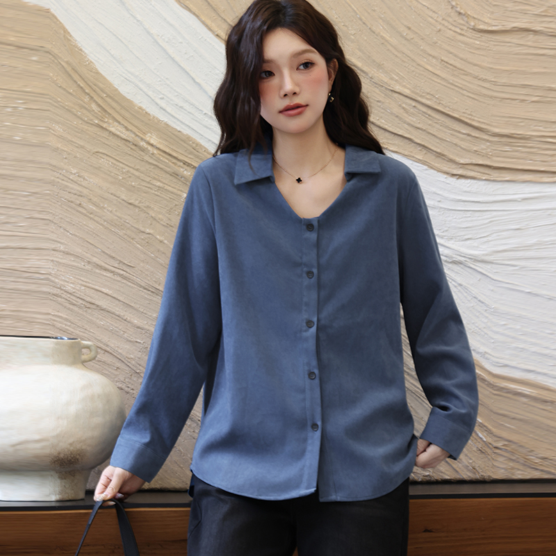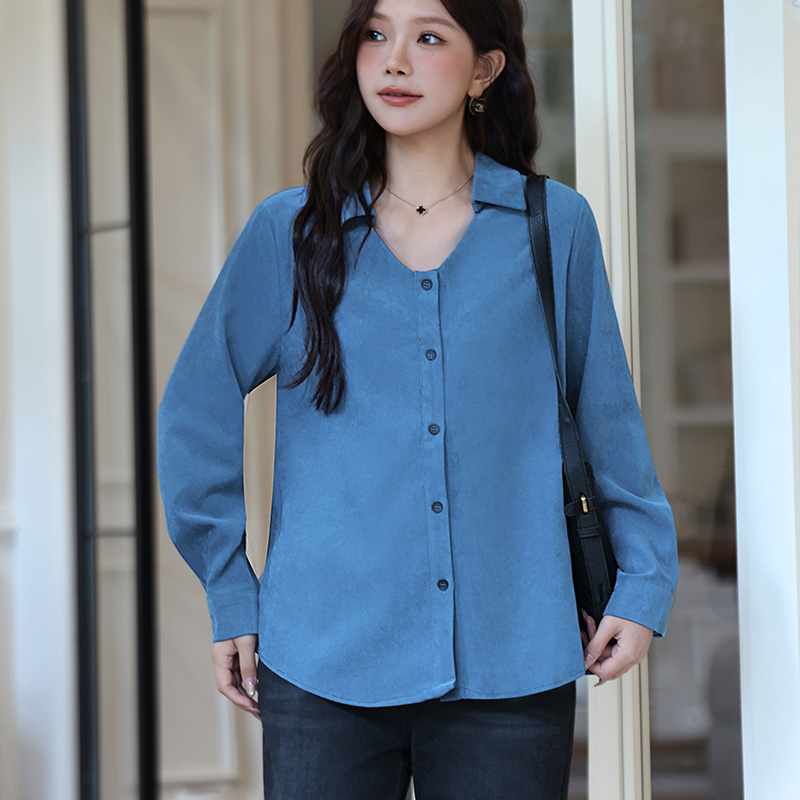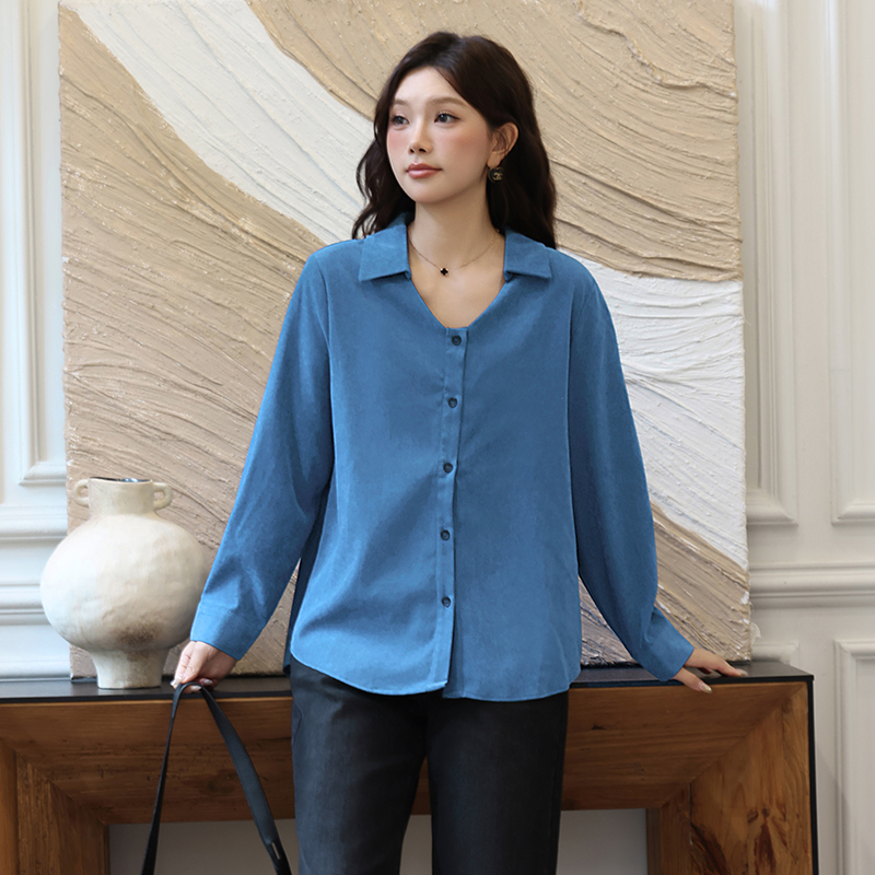 复古蓝色衬衫 衬衣显瘦胖MM上衣开衫 女2025秋冬装 长袖 新款 绮娑大码