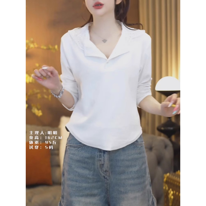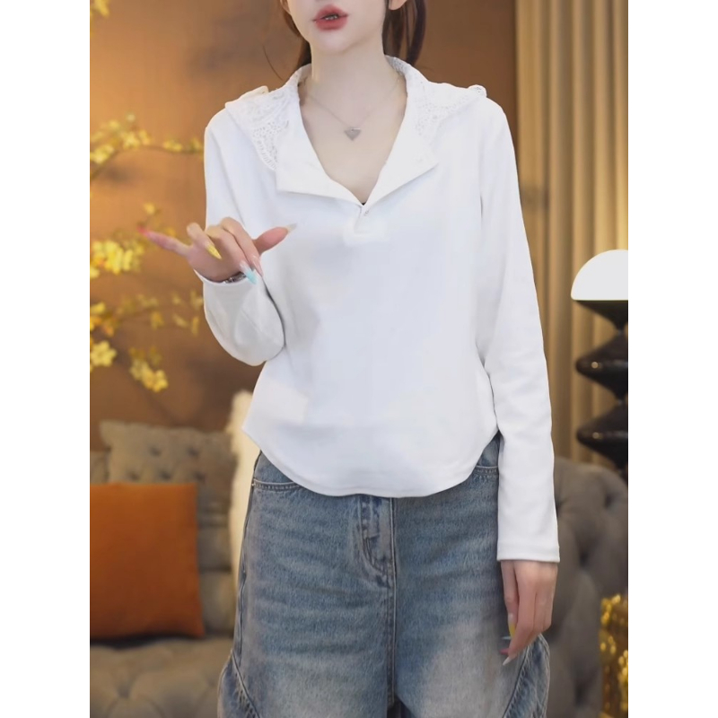 胖mm显瘦打底衫 卫衣大码 上衣 T恤女春秋薄款 纯棉蕾丝连帽白色长袖
