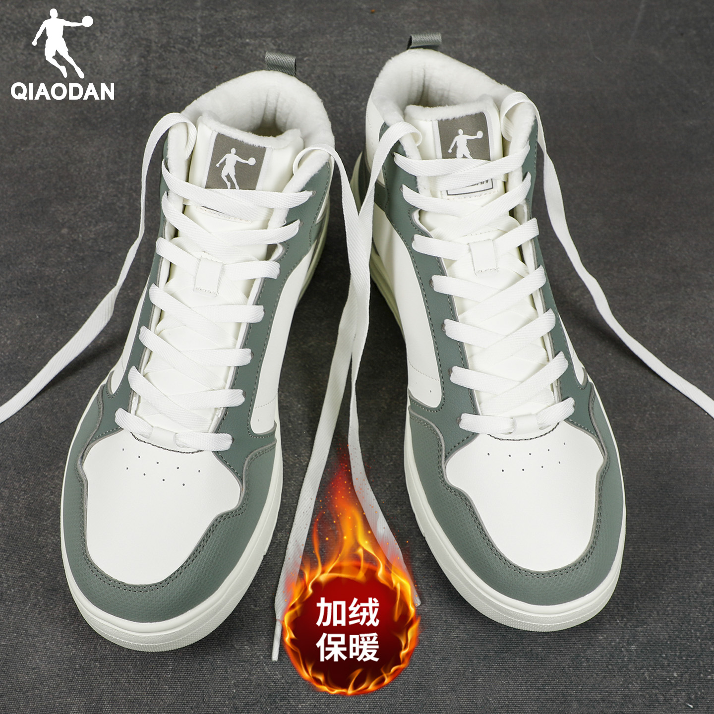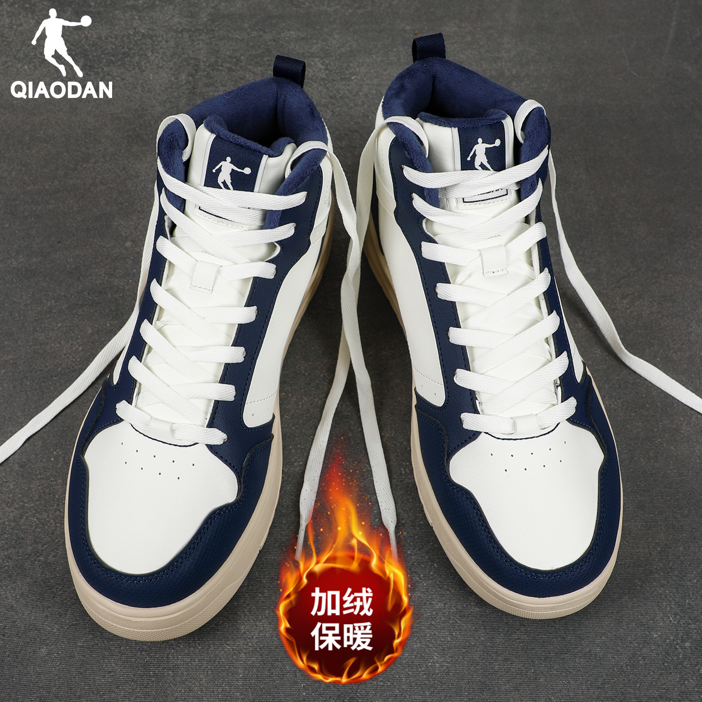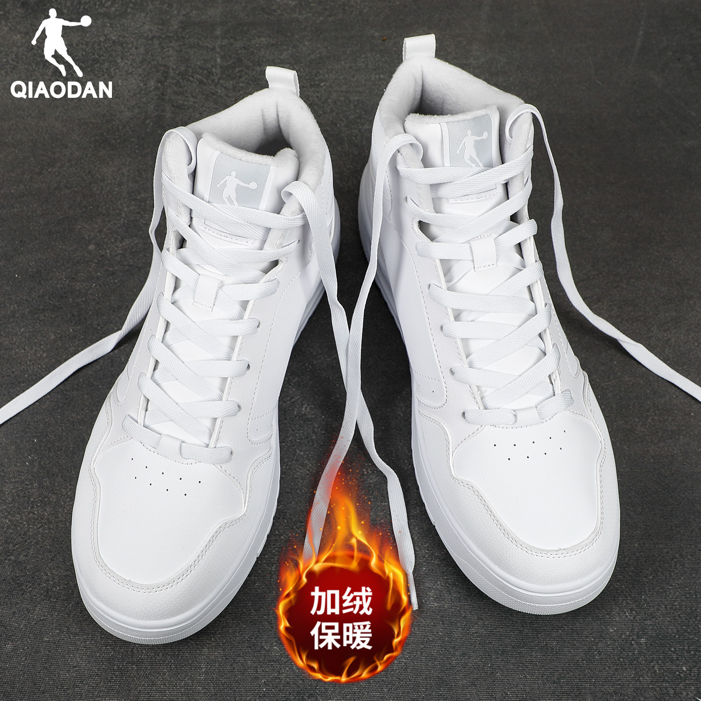 运动鞋 乔丹黑白薄底学生高帮加绒板鞋 棉鞋 新款 皮面保暖休闲男 秋季