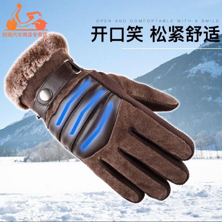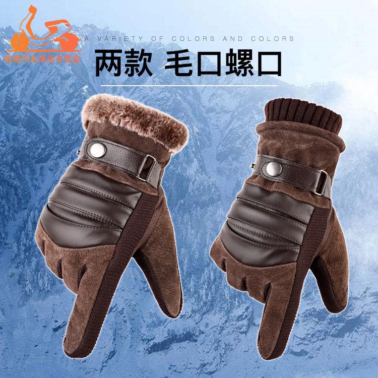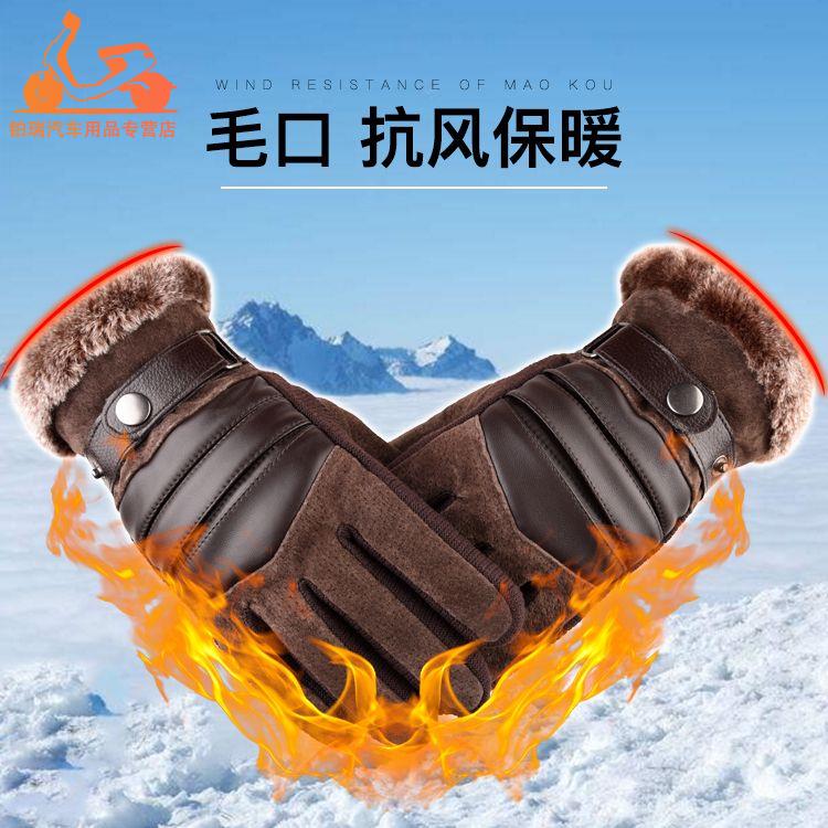棉手套男士 户外骑行摩托车保暖加厚加绒骑车分指触屏猪皮手套 冬季