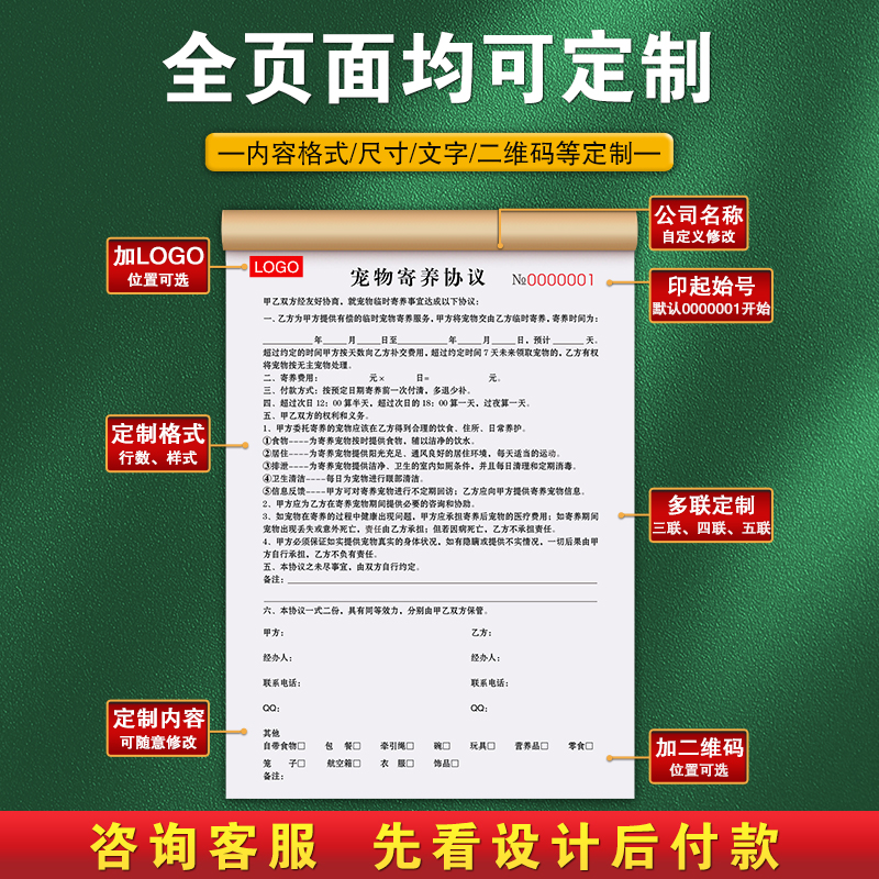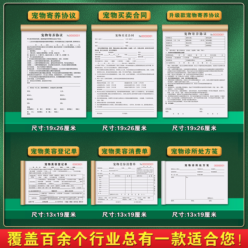 宠物寄养协议书狗狗活体买卖领养合同兽医活物处方笺洗护服务交易记录本前台接待消费单宠物店洗澡美容登记表