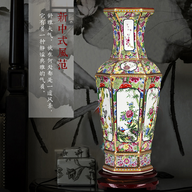 景德镇陶瓷器花瓶仿乾隆珐琅彩六方瓶复古插花摆件中式 饰品 家居装