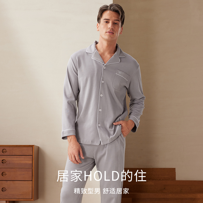 大码 长袖 长裤 猫人纯棉睡衣男士 家居服套装 2025新款 纯色男士 春秋款