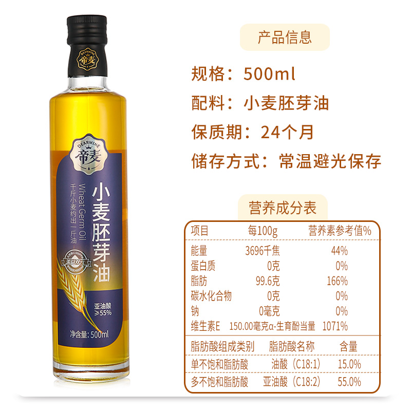 帝麦纯小麦胚芽油含维生素E植物油 500ml旗舰店正品