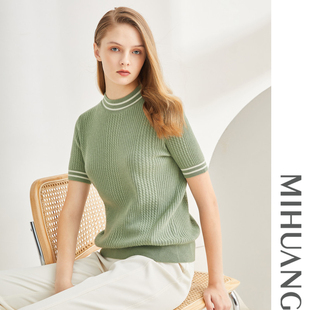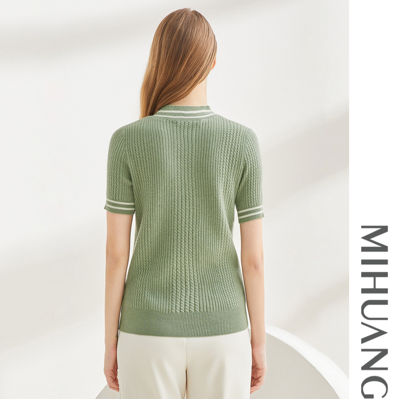 羊绒衫 套头圆领短袖 女休闲纯色提花纯羊绒毛衣 新款 米皇秋季