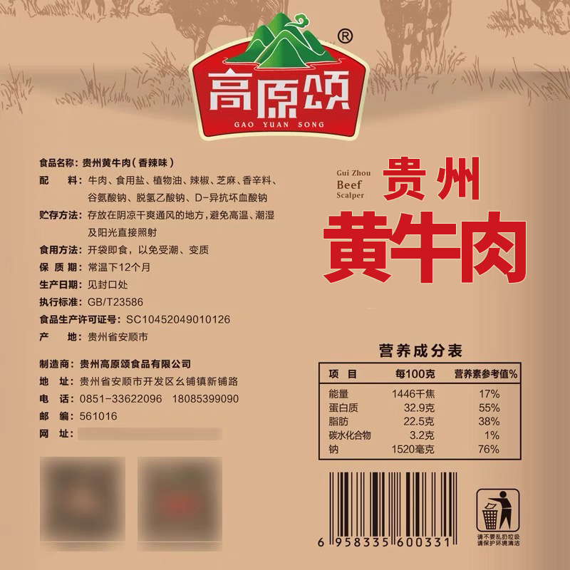 高原颂贵州黄牛肉208g贵州特产麻辣牛肉即食熟食香辣牛肉干小袋装