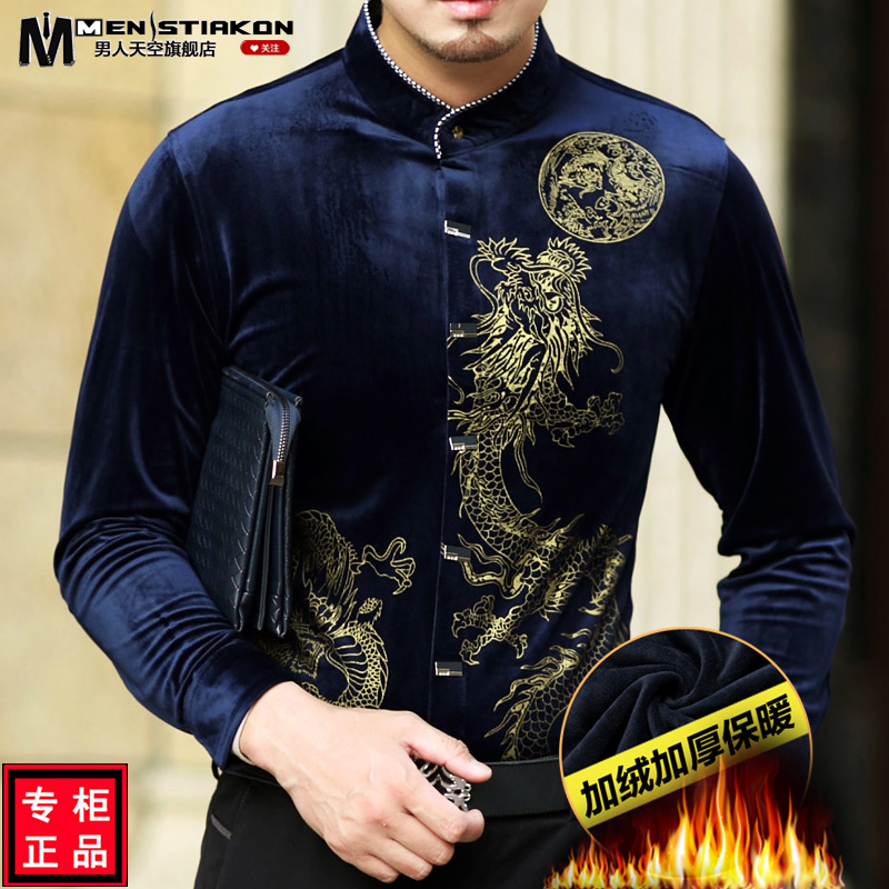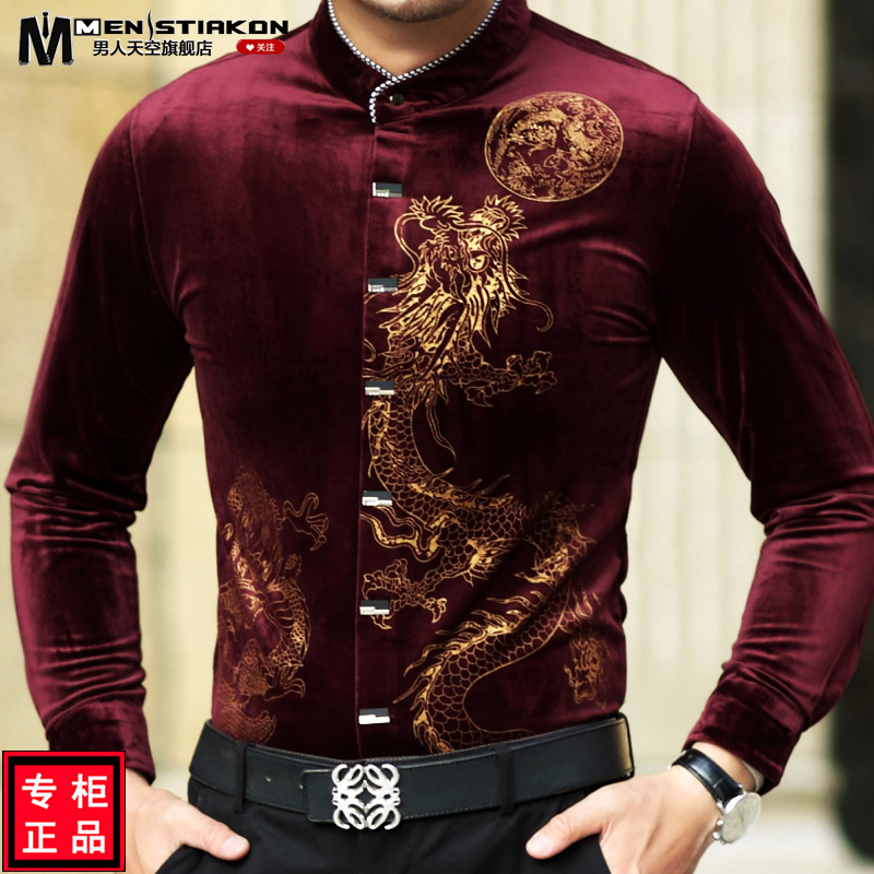 男士 印花衬衣中年商务休闲金丝绒寸衫 长袖 薄款 男中国风 衬衫 秋季