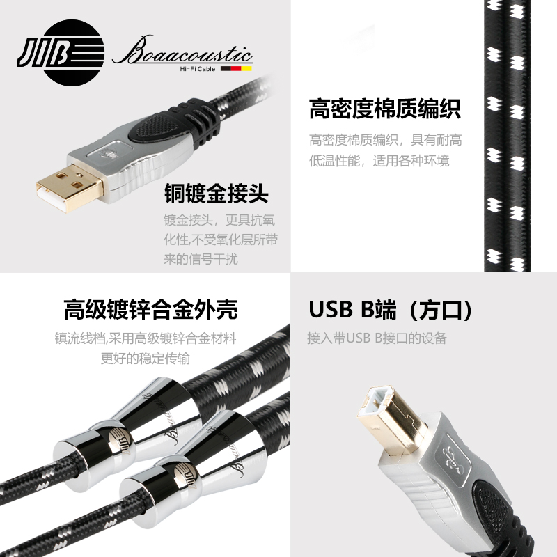 JIB德国蟒蛇原装 音频线A对B方口6N单晶铜镀银加单晶铜芯双层屏蔽镀金接头BEB2020 进口HIFI高端发烧级usb解码