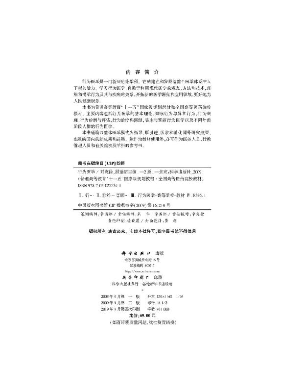 顾瑜琦 编 十一五 行为医学 科学出版 刘克俭 规划教材·医药院校教材 社 第2版