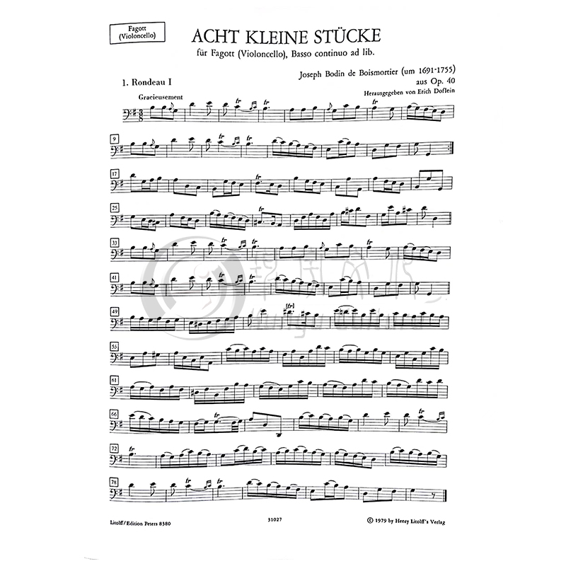 Bodin 8首小品 乐谱 博伊斯摩帝尔 Pieces 巴松管或大提琴和钢琴 Little 选自Op40 EP8380 彼得斯原版 Boismortier Joseph