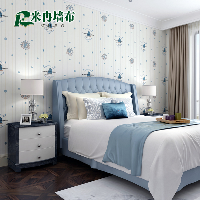 地中海风格 无缝卧室男孩女孩房间亚麻墙布卡通帆船卧室竖条纹壁布