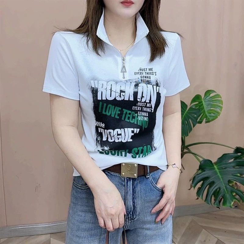 中年妈妈洋气减龄显瘦上衣 宽松大码 半拉链POLOT恤女短袖 2025新款